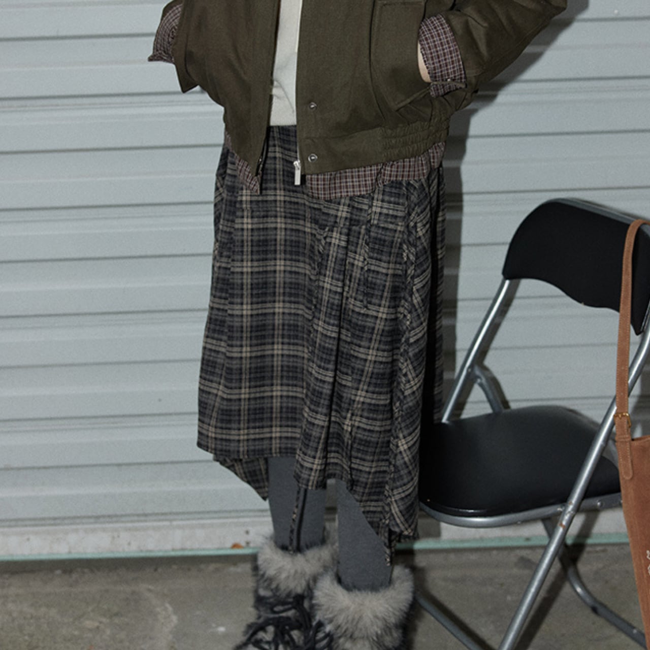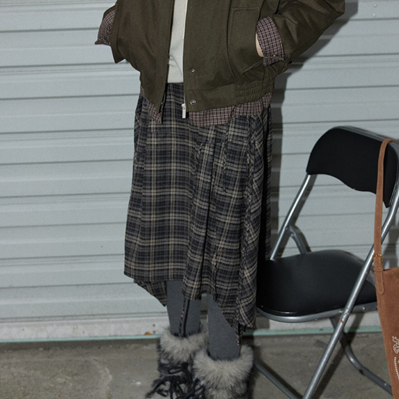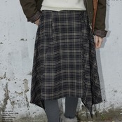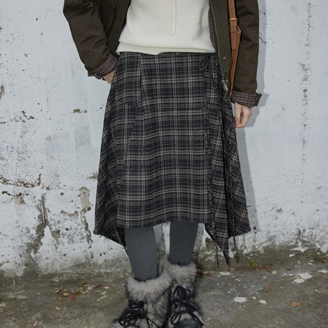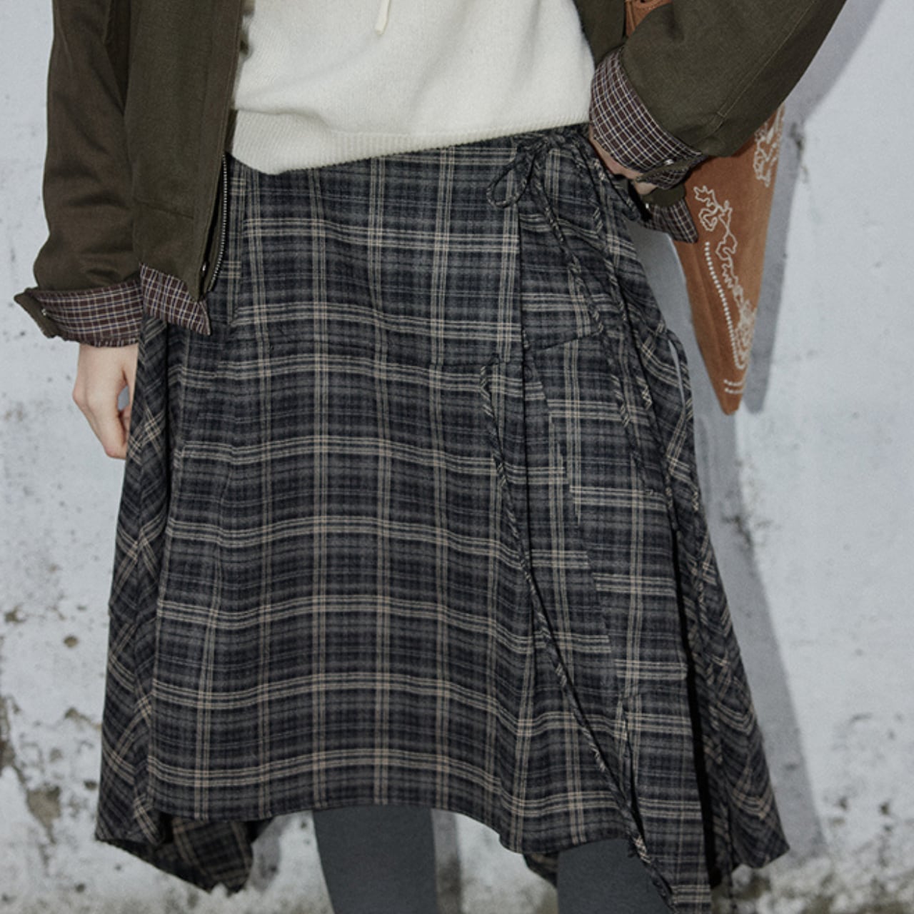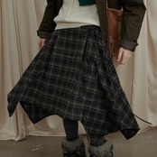 落ち着いたチェック柄が印象的な、ラップデザインのスカート。