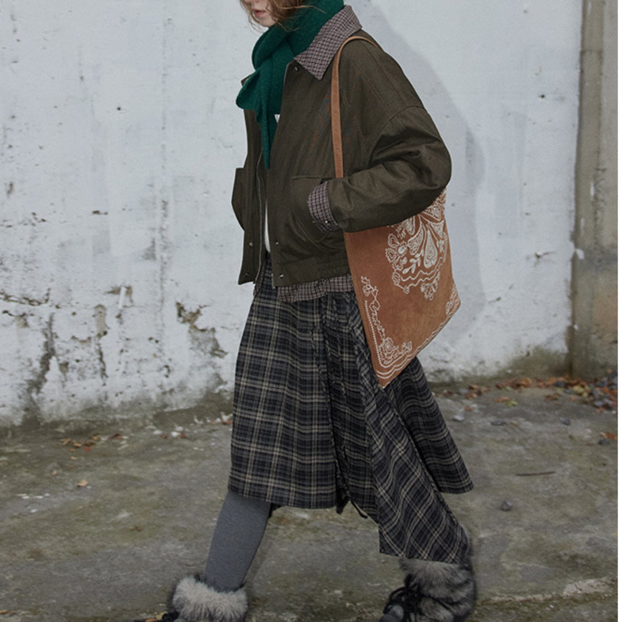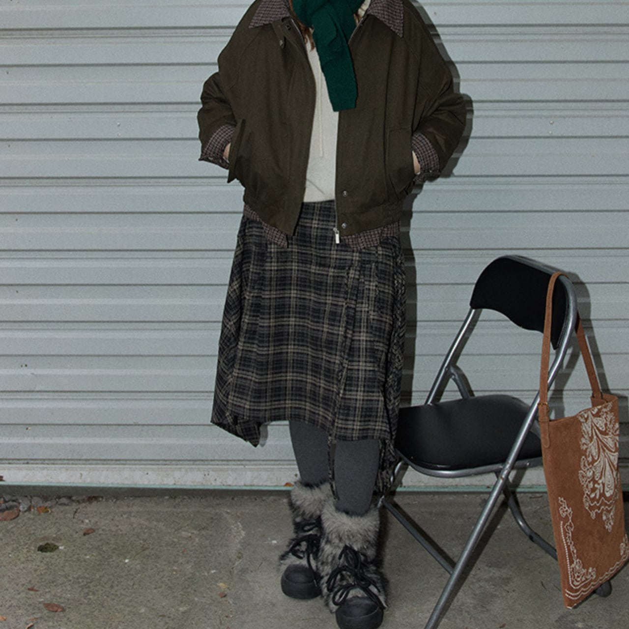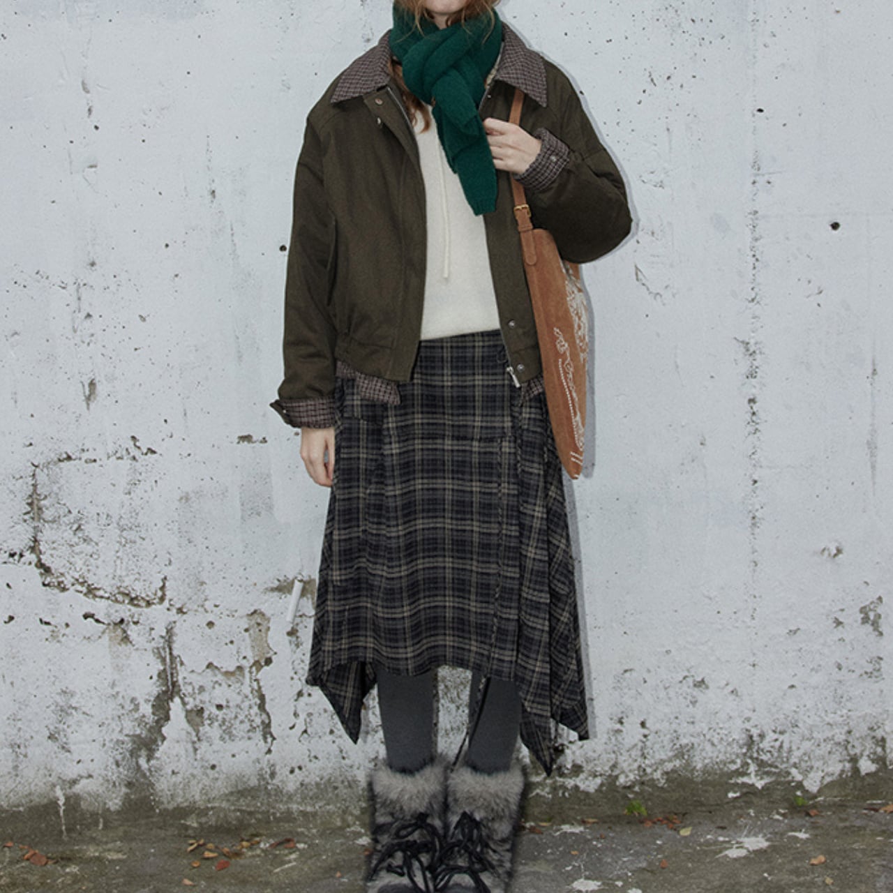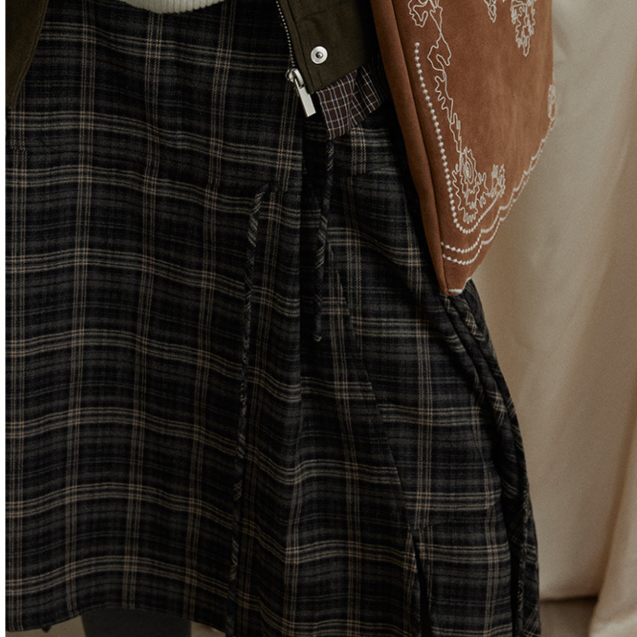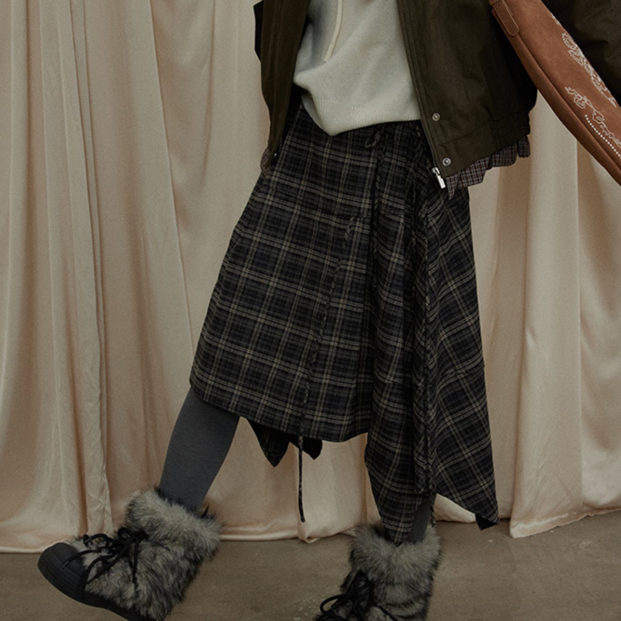 落ち着いたチェック柄が印象的な、ラップデザインのスカート。