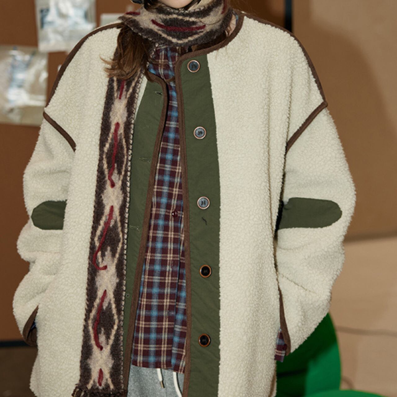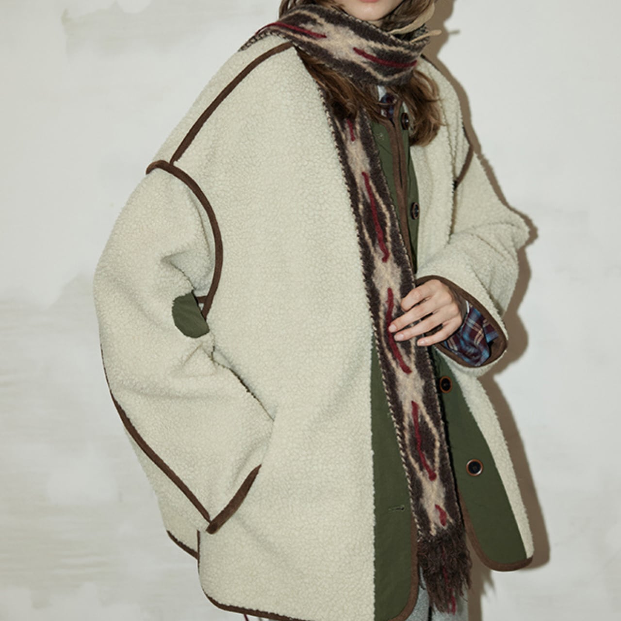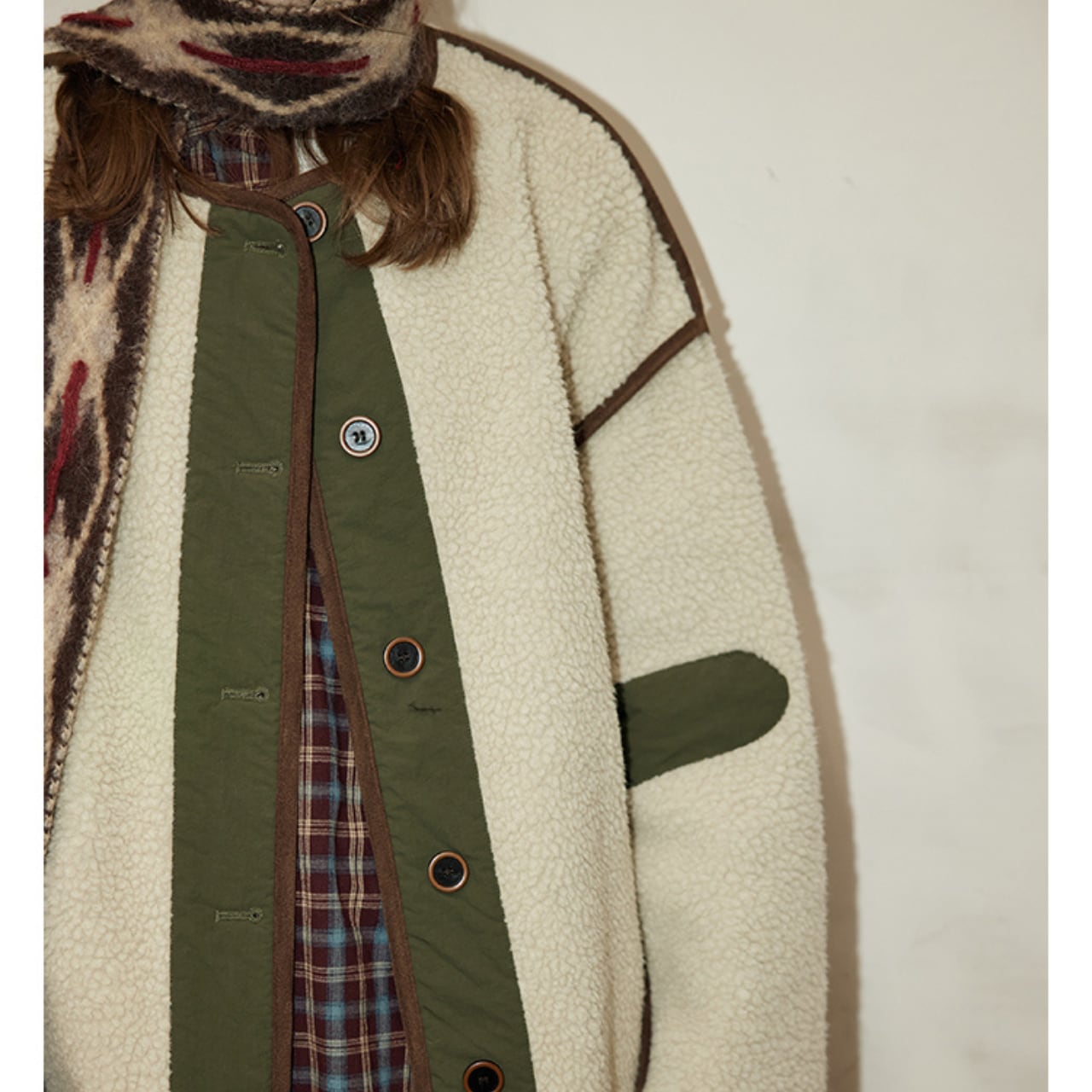 もこっとしたフリース素材に、配色パイピングと切り替えデザインが映えるヴィンテージライクなジャケット。