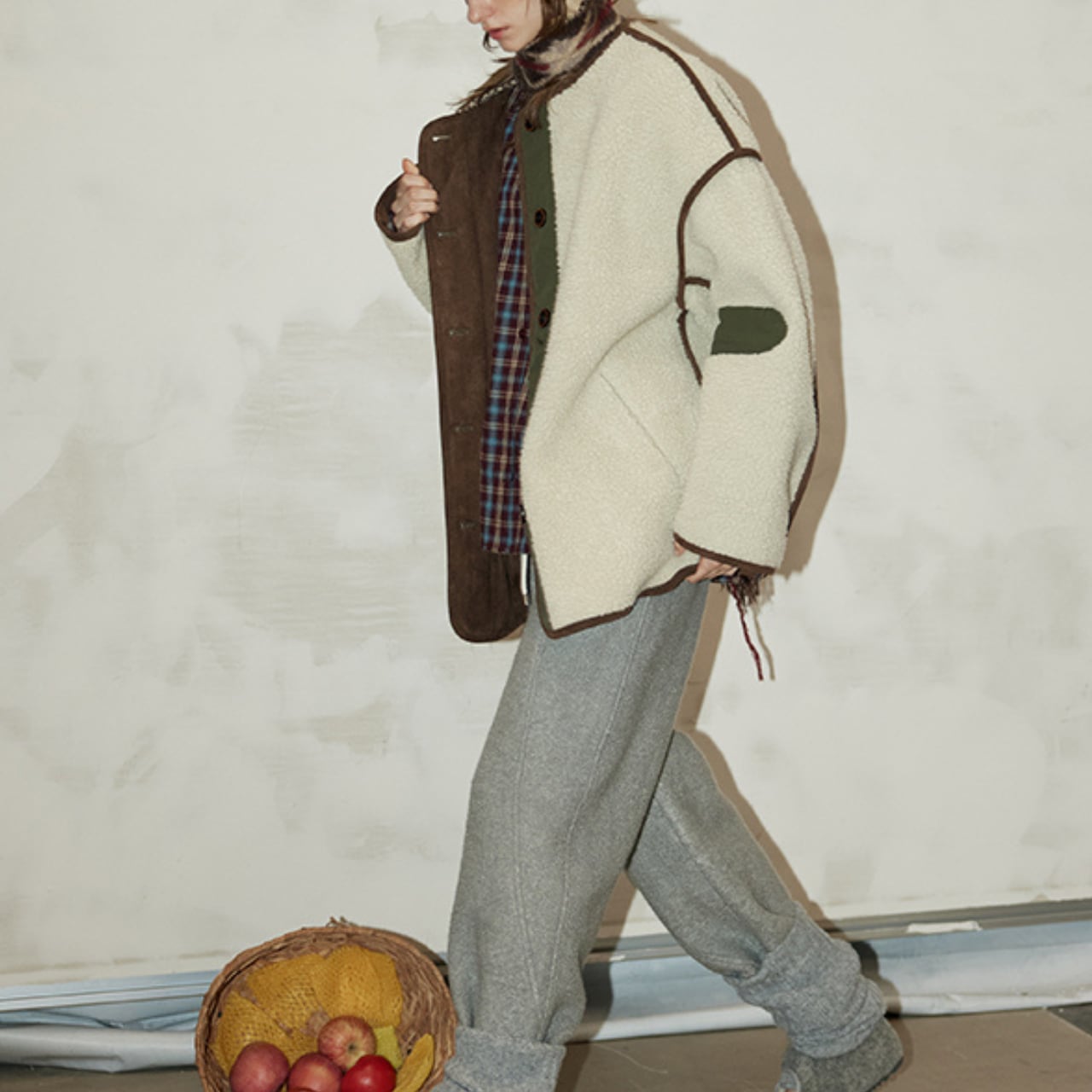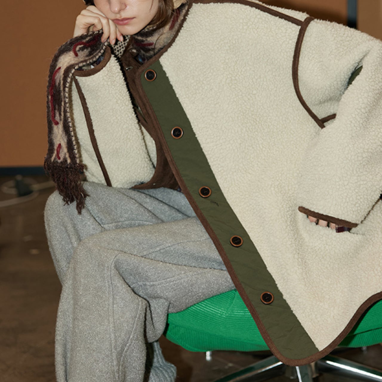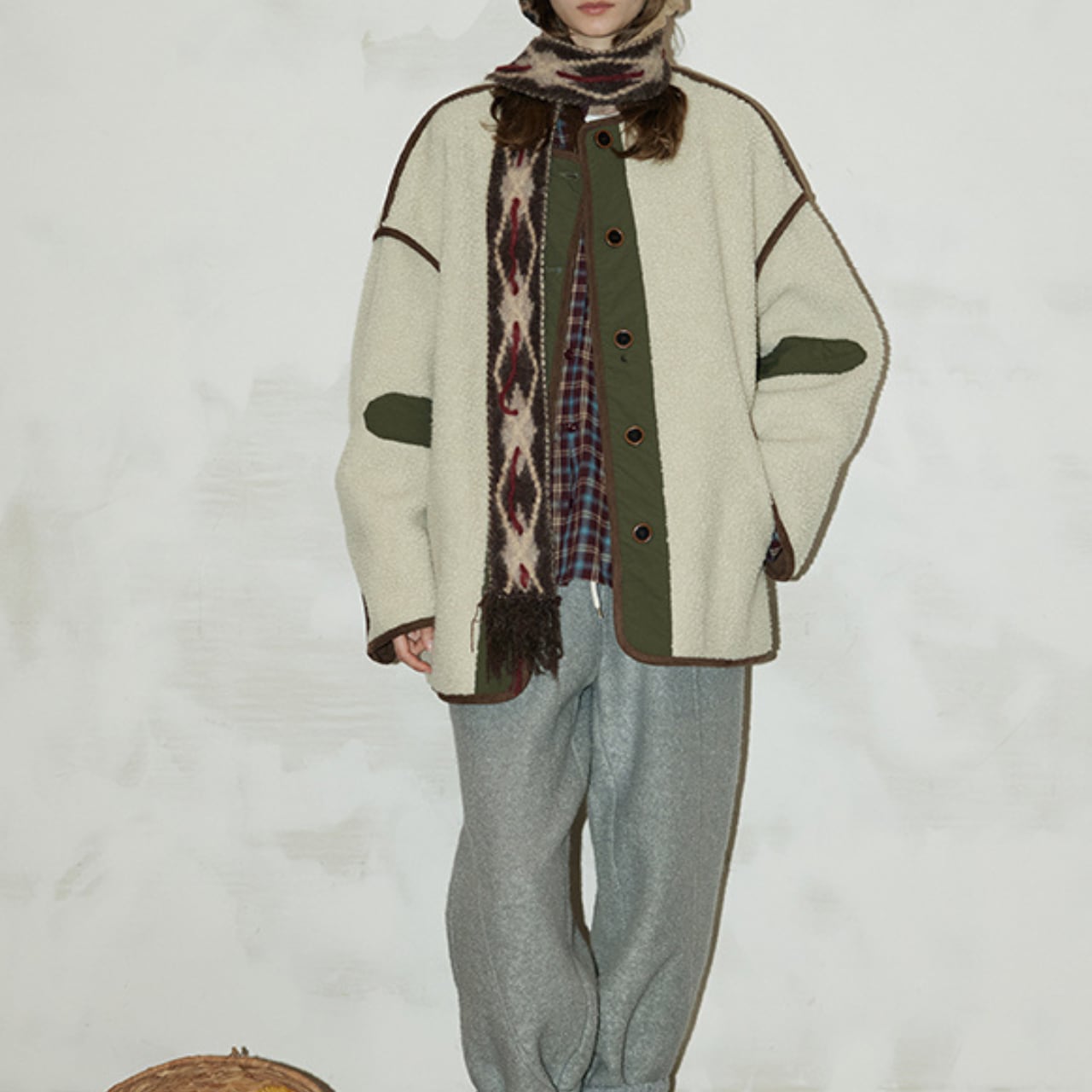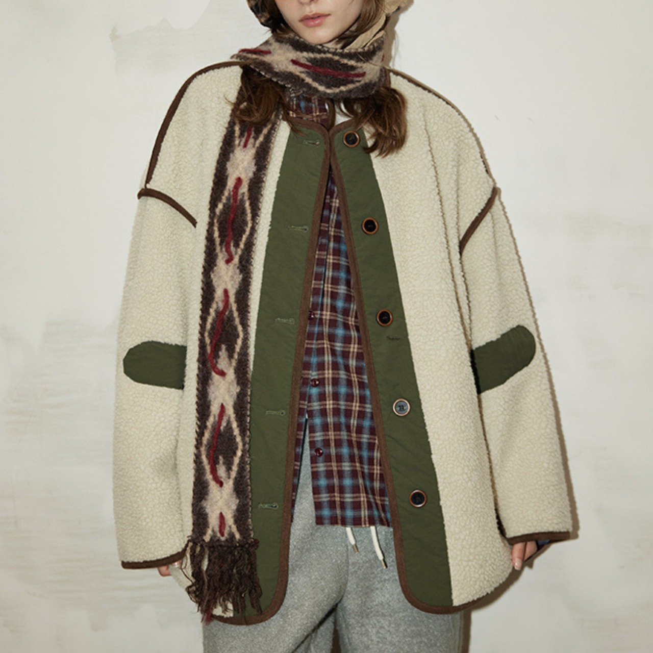 もこっとしたフリース素材に、配色パイピングと切り替えデザインが映えるヴィンテージライクなジャケット。