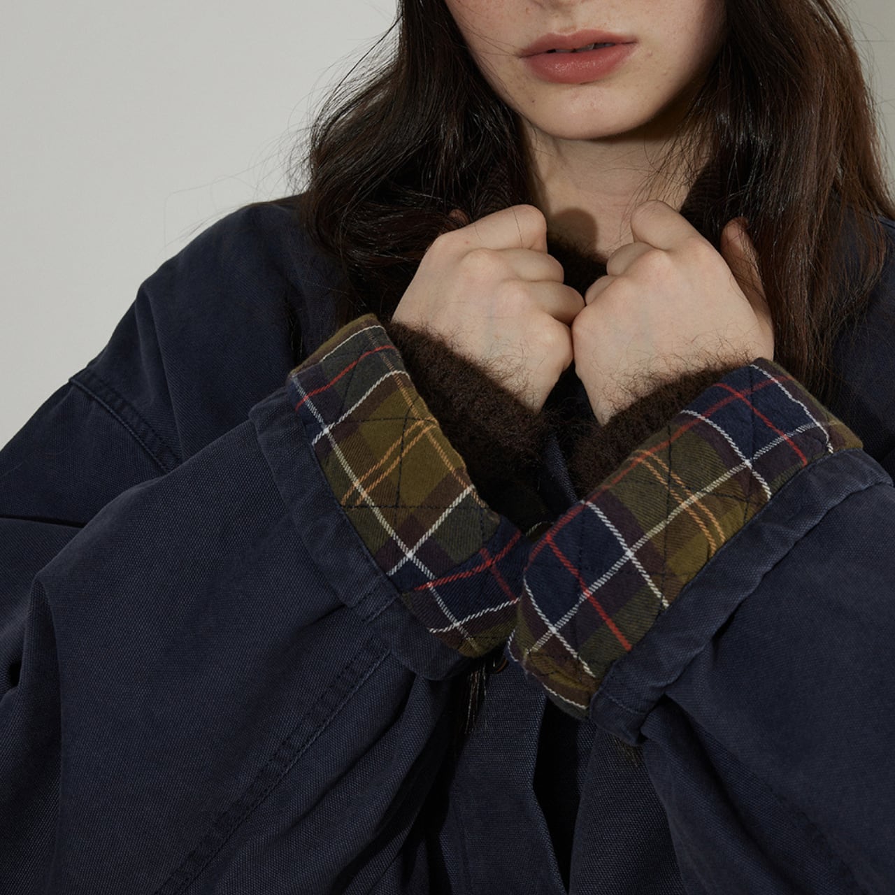 袖口や前を開けたときに覗くチェック柄の裏地が、コーディネートのアクセントになります。