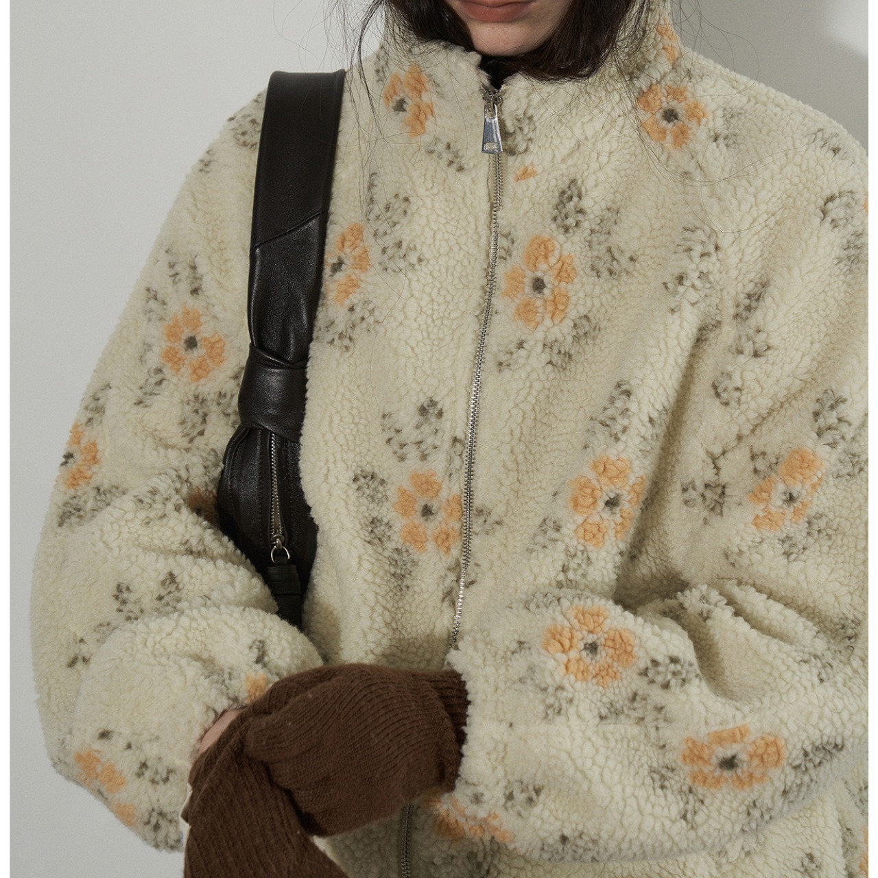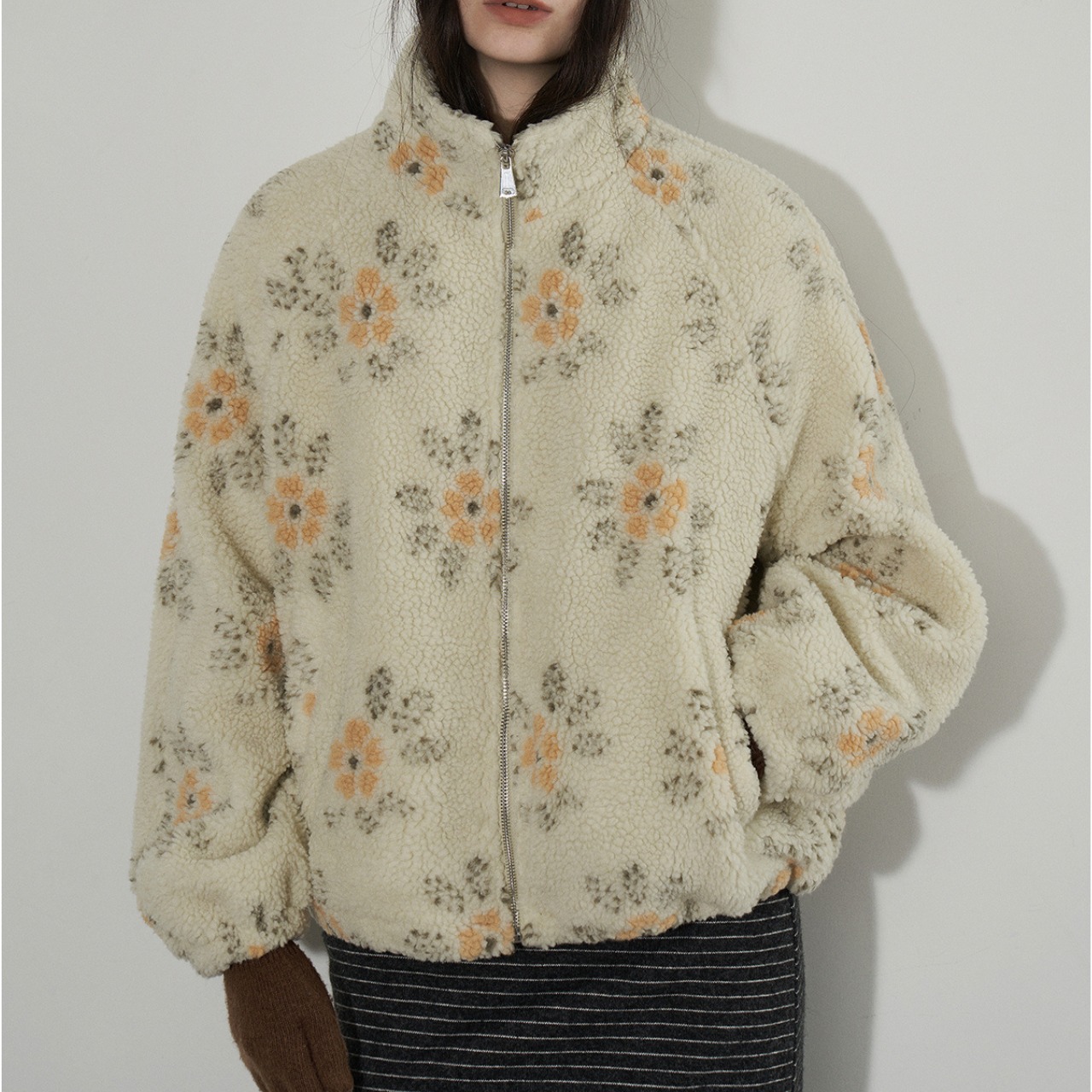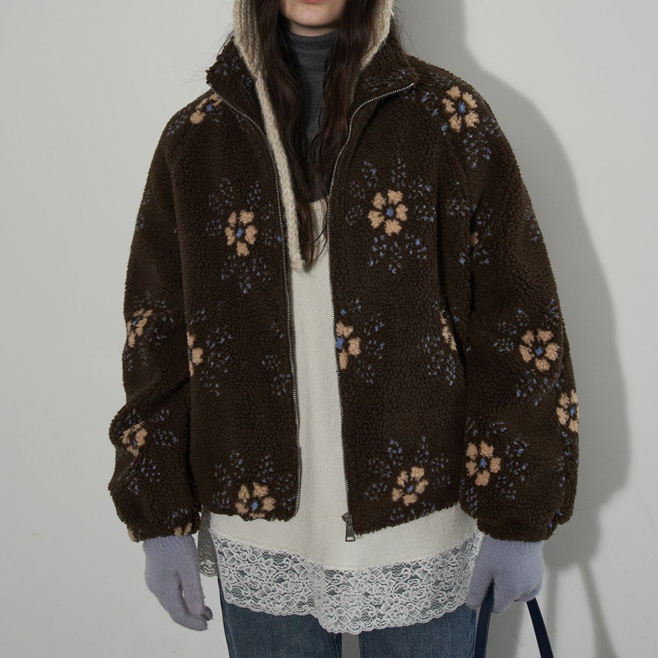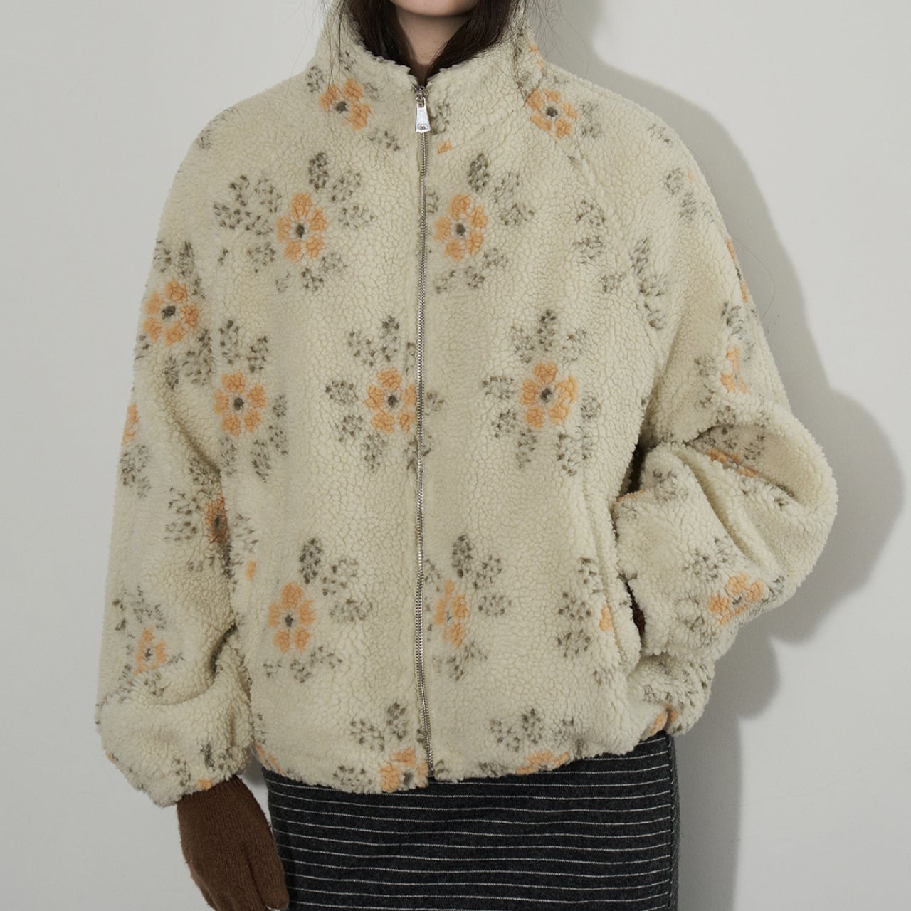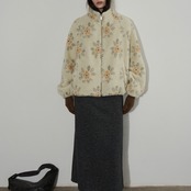 ふんわりとしたボア素材に、やさしいフラワーパターンを散りばめたジップアップジャケット。