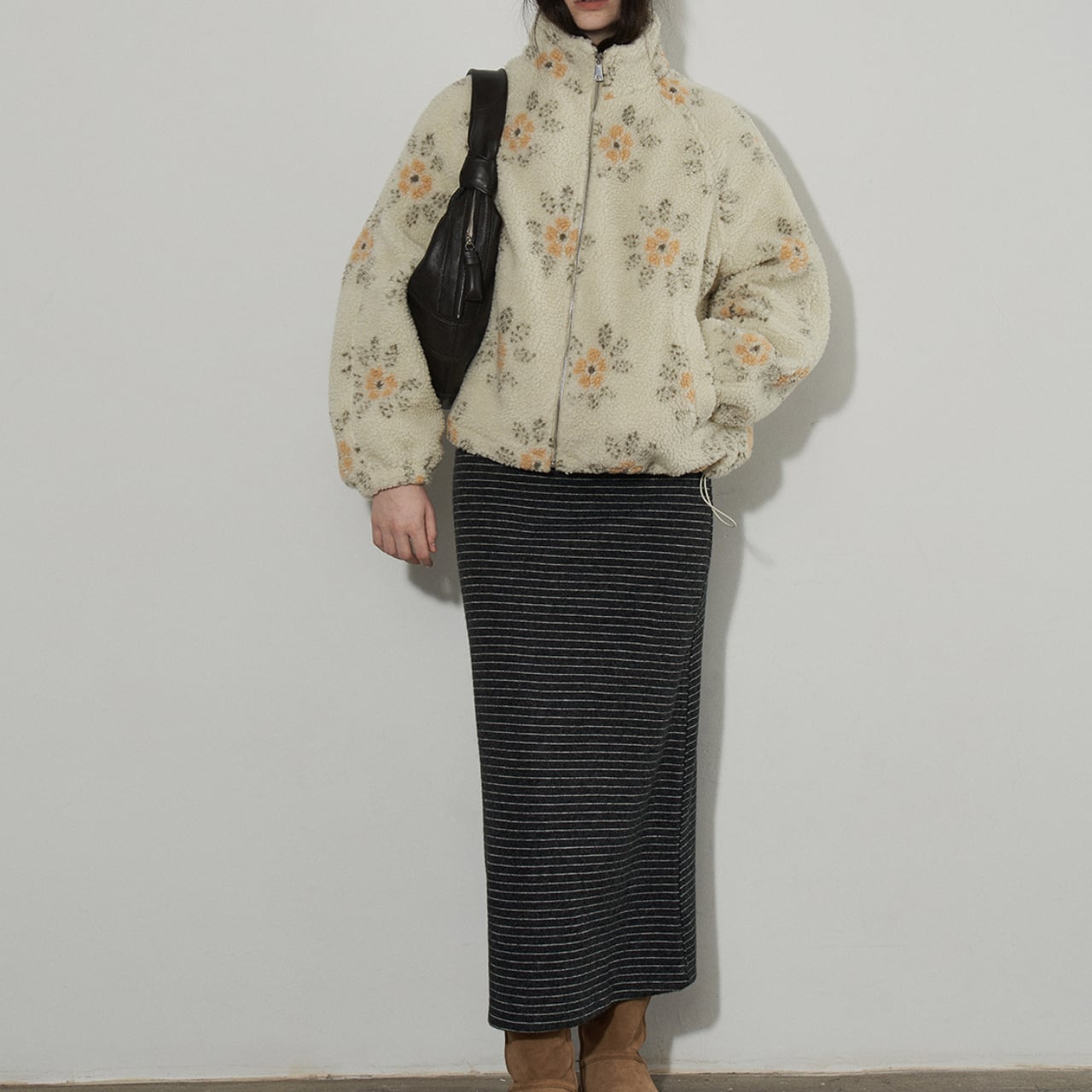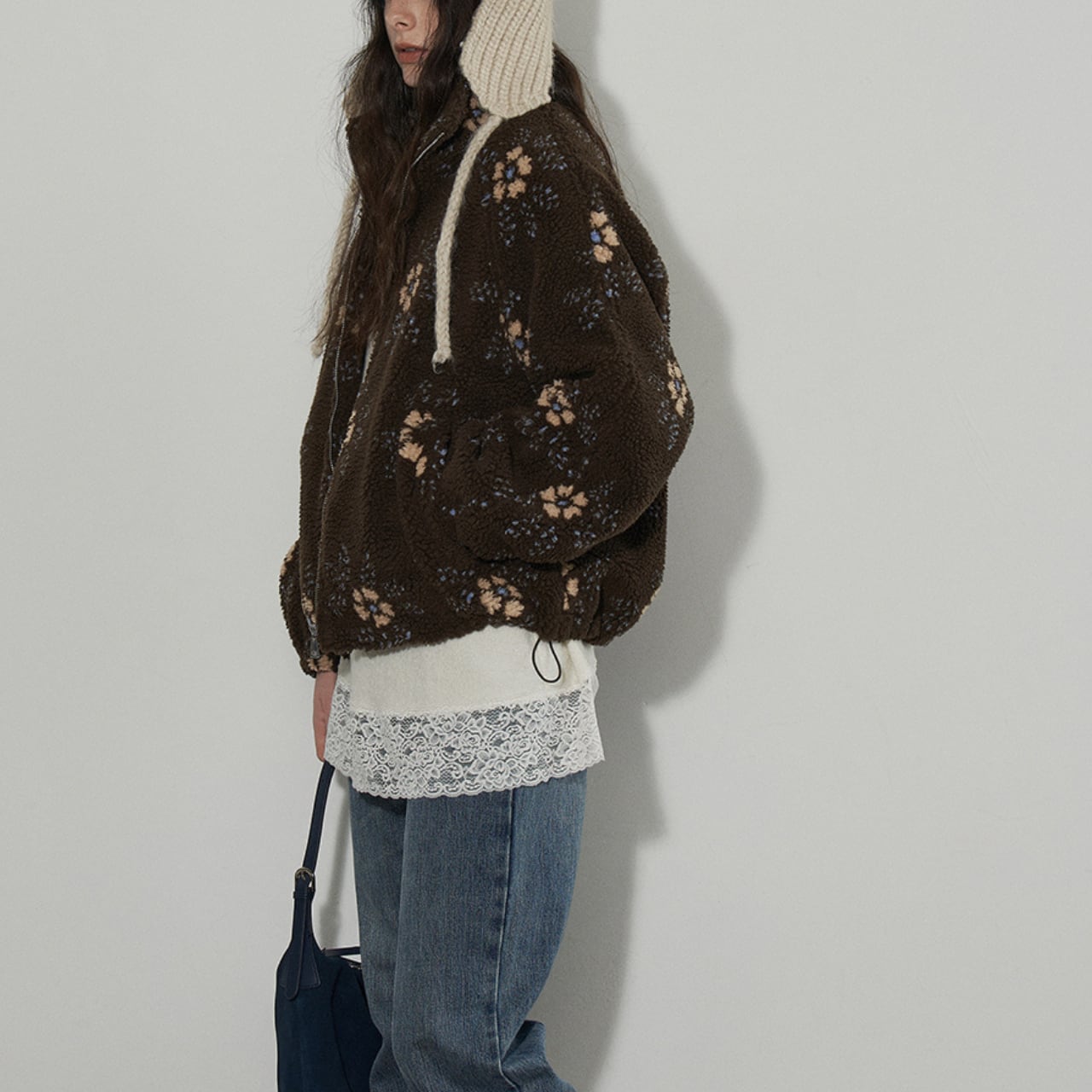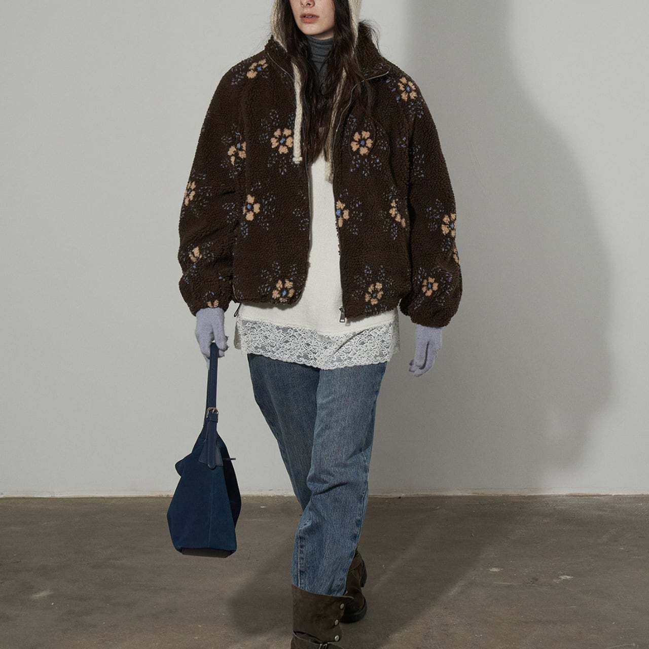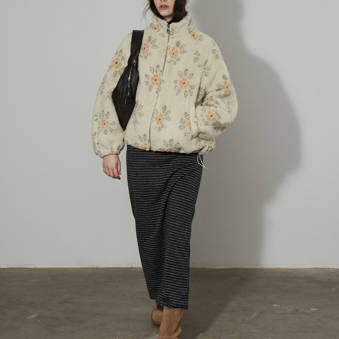 ふんわりとしたボア素材に、やさしいフラワーパターンを散りばめたジップアップジャケット。