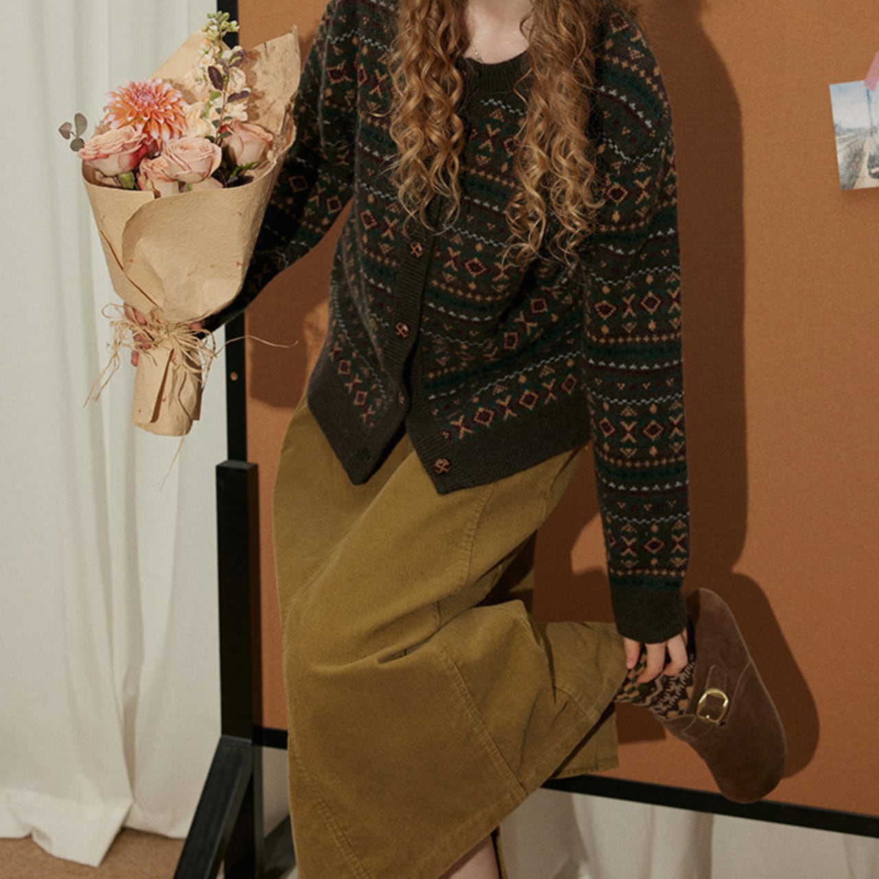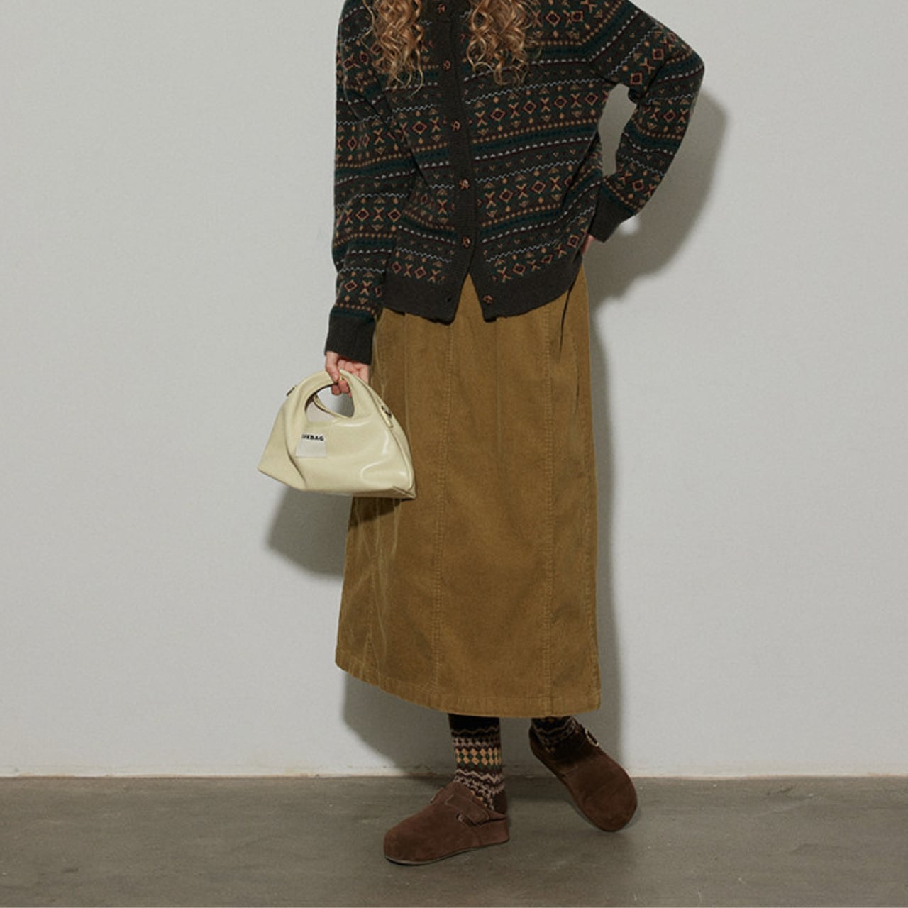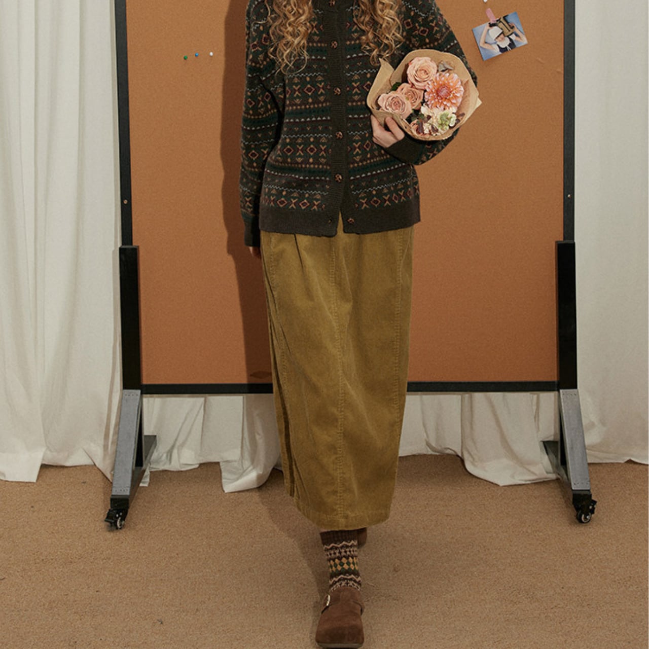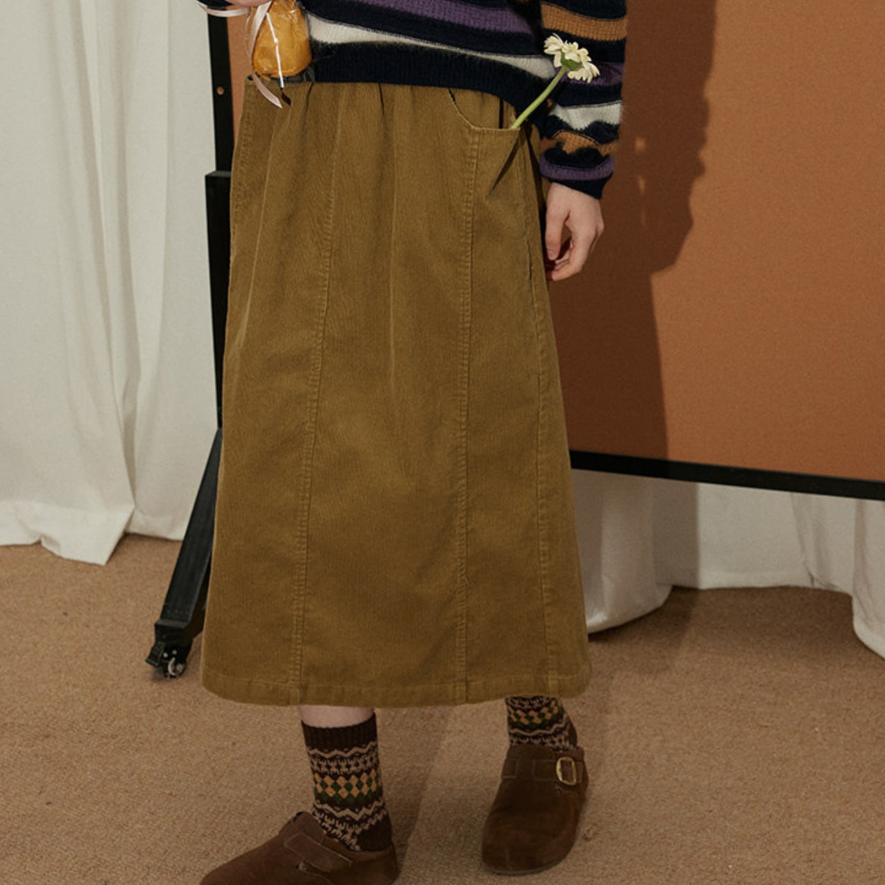 温かみのあるコーデュロイ素材を使用したミディ丈スカート。