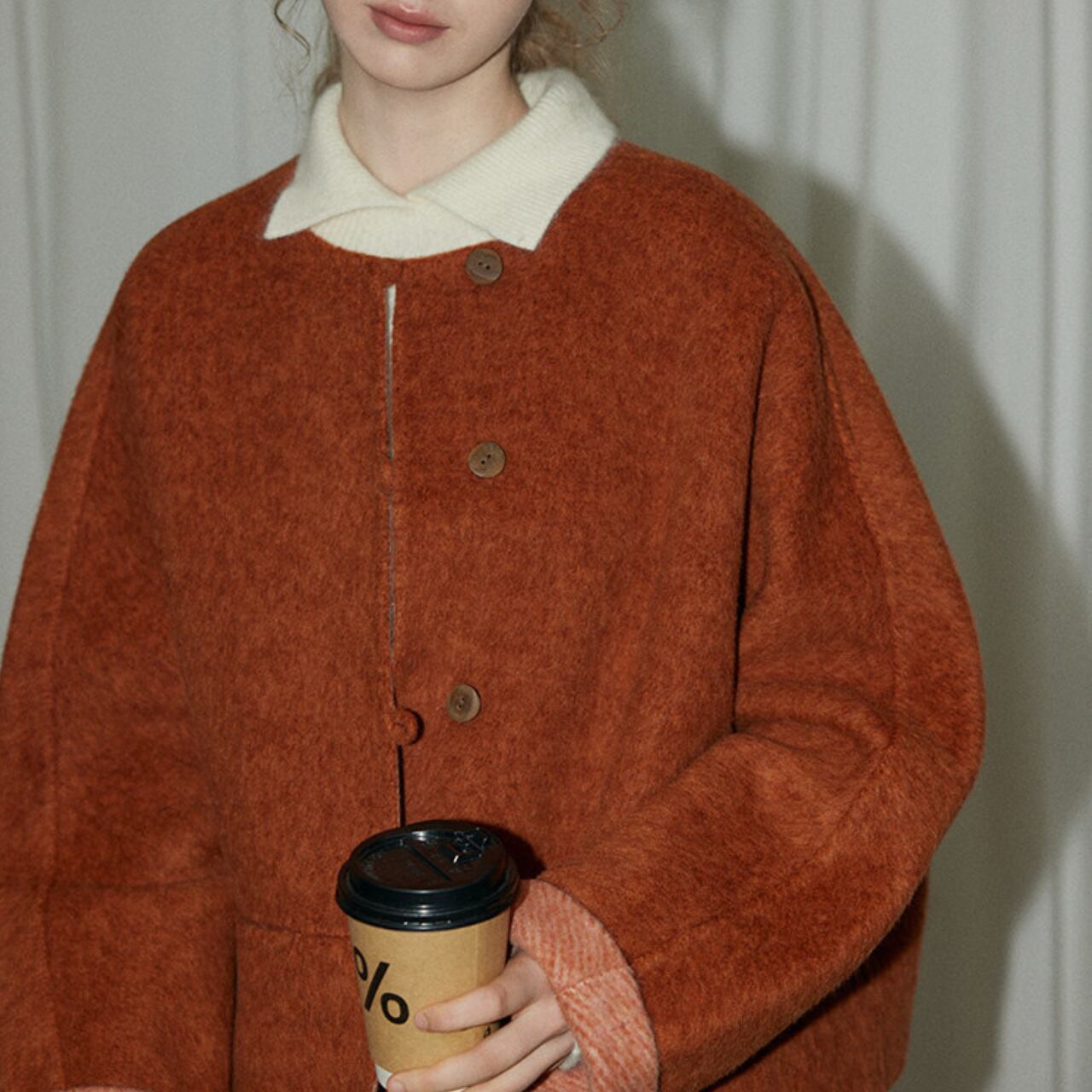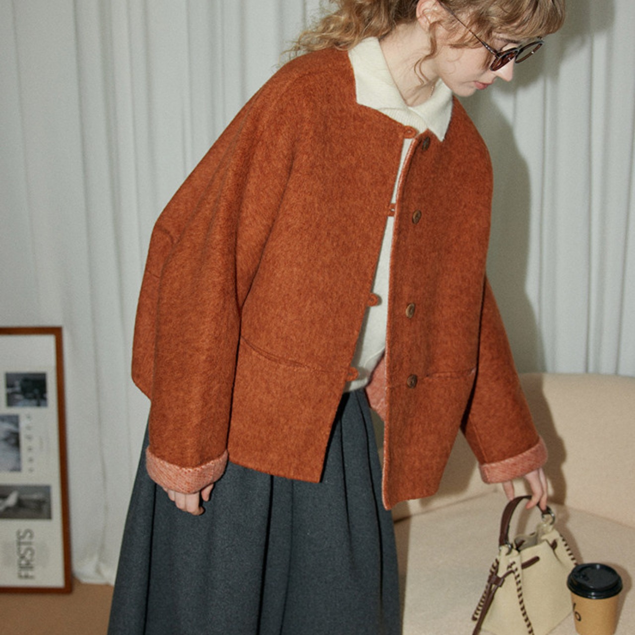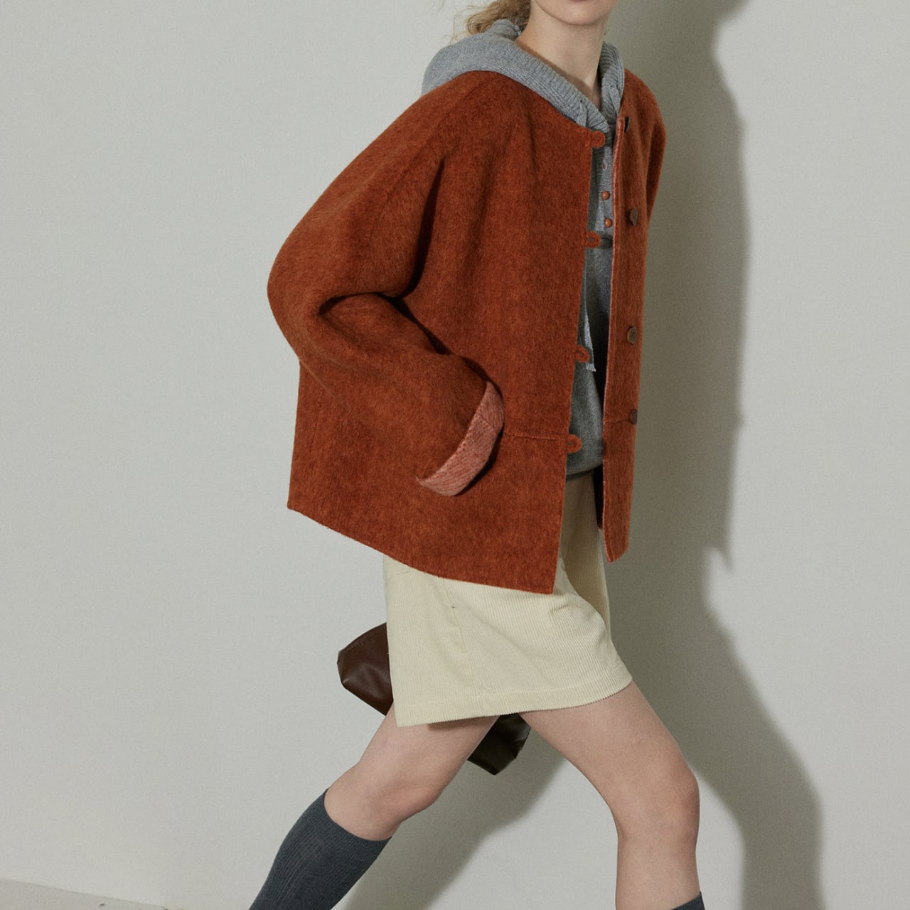 ノーカラーのデザインが、首元をすっきりと見せてくれるジャケットです。