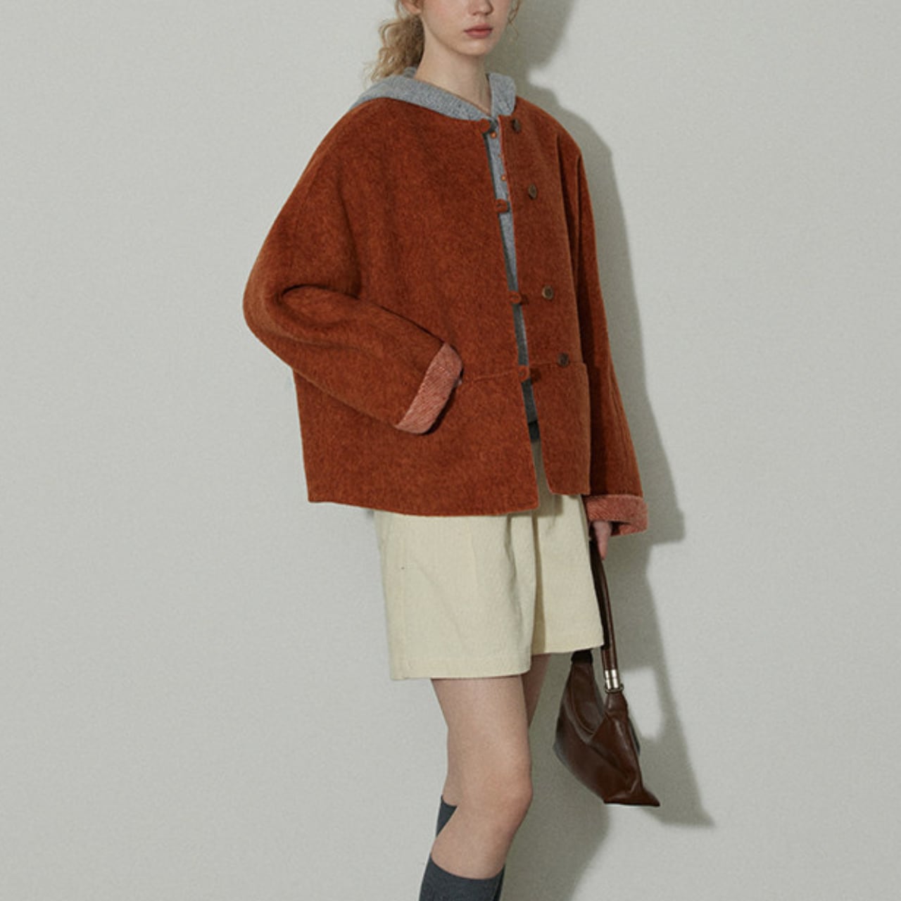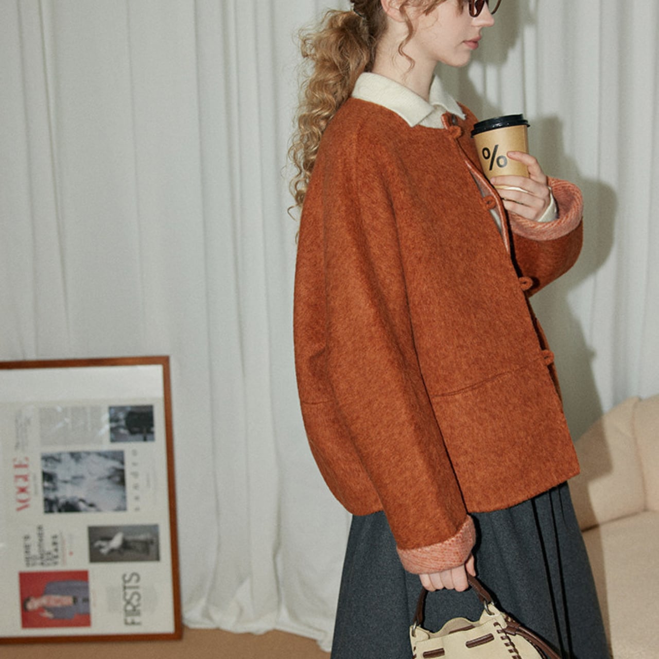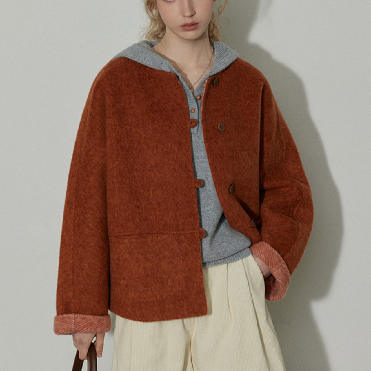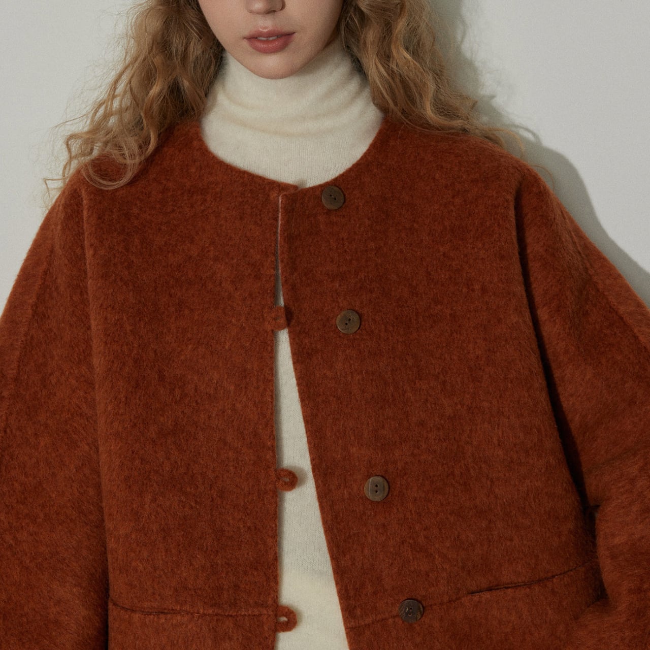 ノーカラーのデザインが、首元をすっきりと見せてくれるジャケットです。