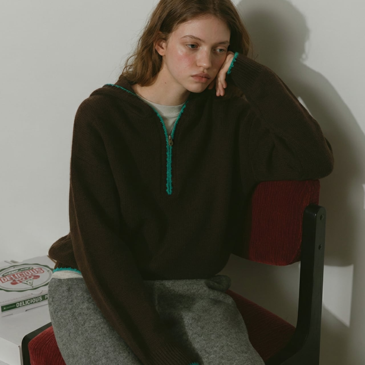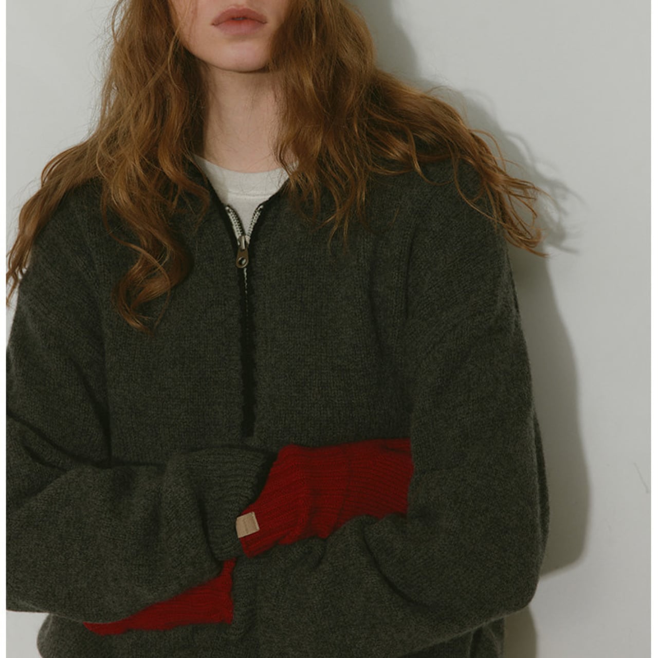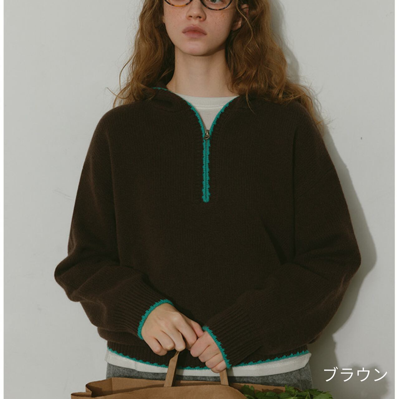 ハーフジップデザインが特徴的なニットフーディー。