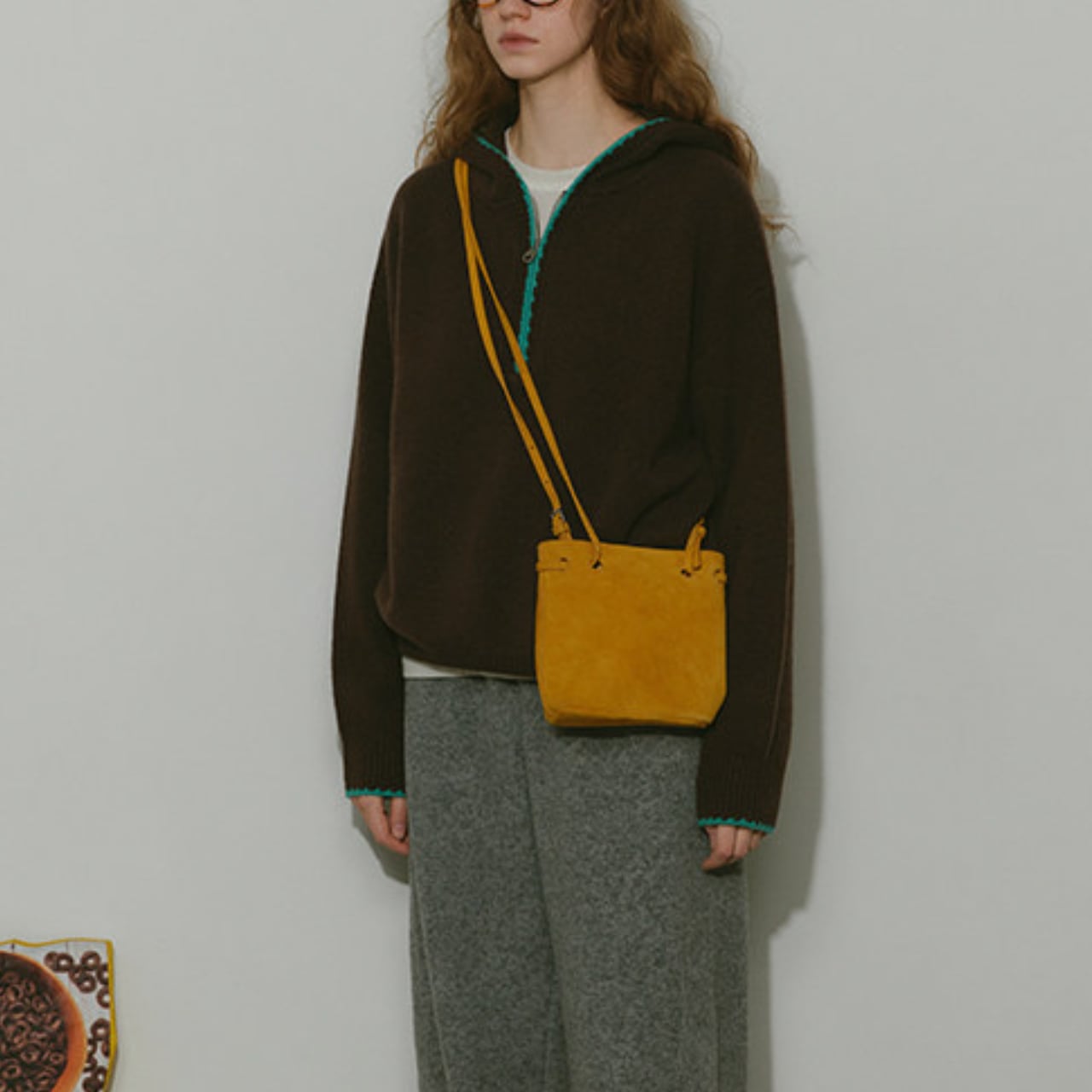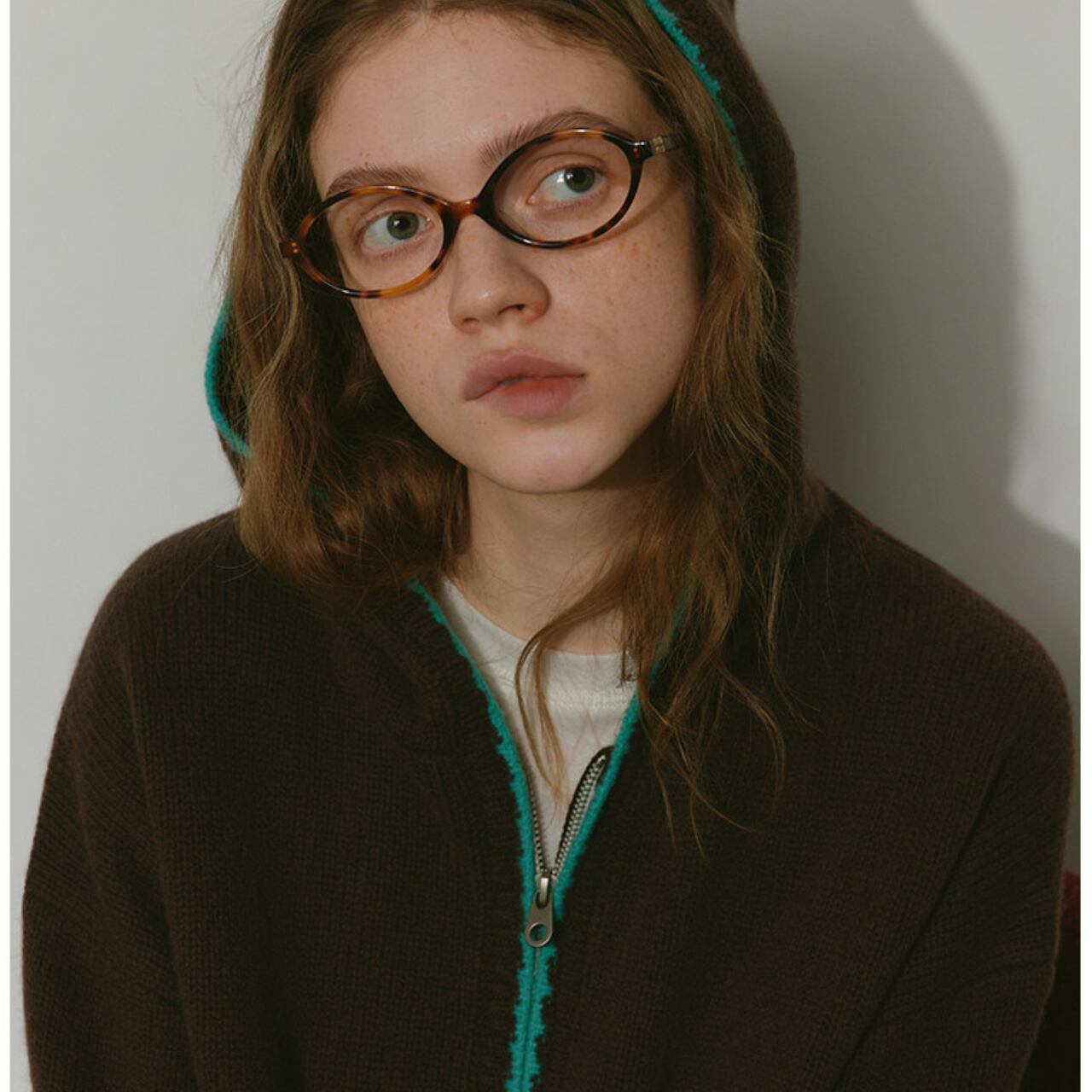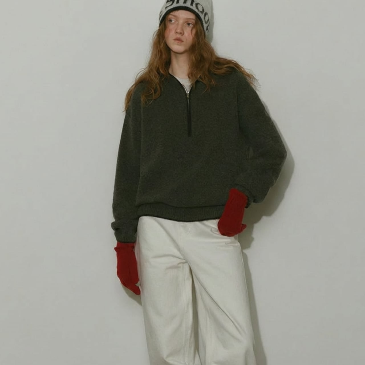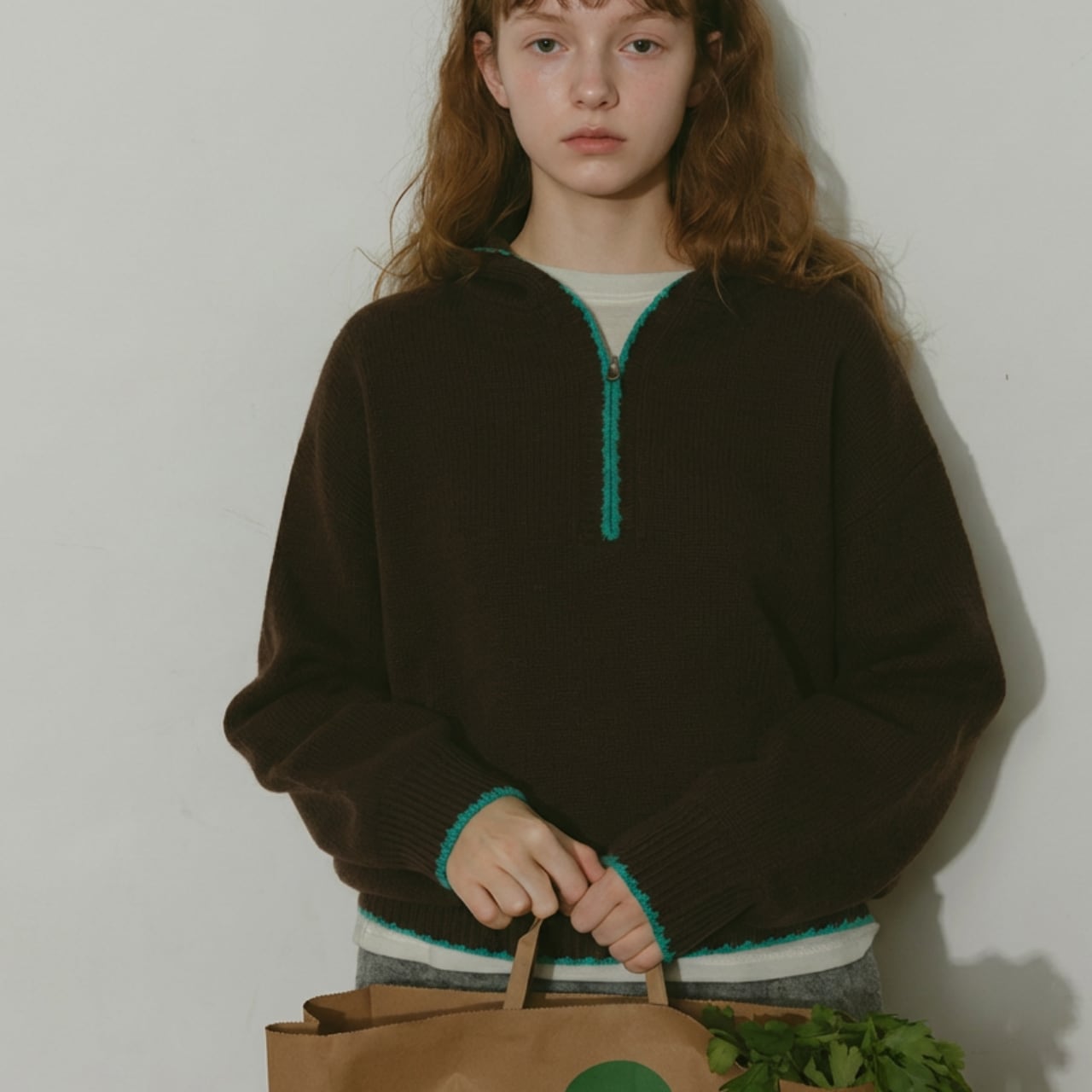 ハーフジップデザインが特徴的なニットフーディー。
