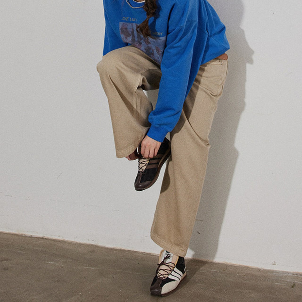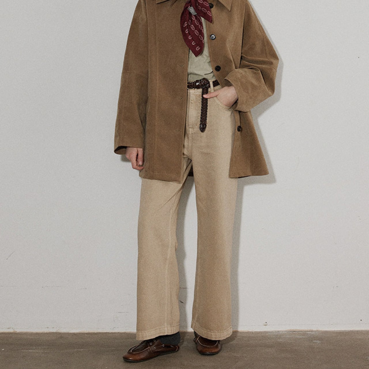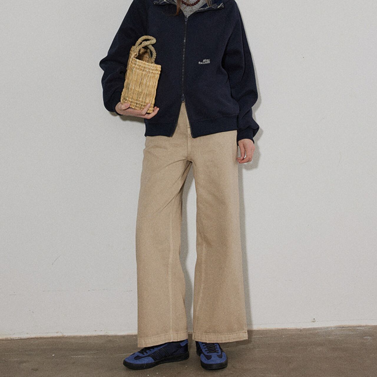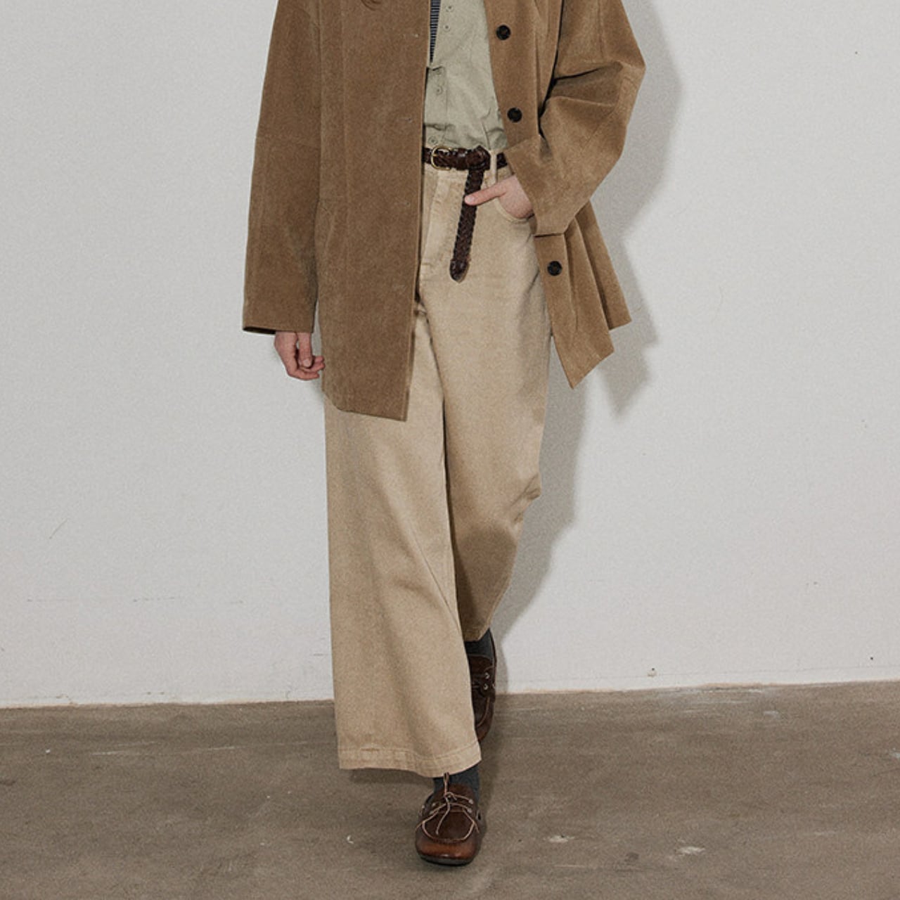 ストンと落ちるストレートシルエットで、脚のラインをきれいに見せつつ、リラックス感のある穿き心地に仕上げています。