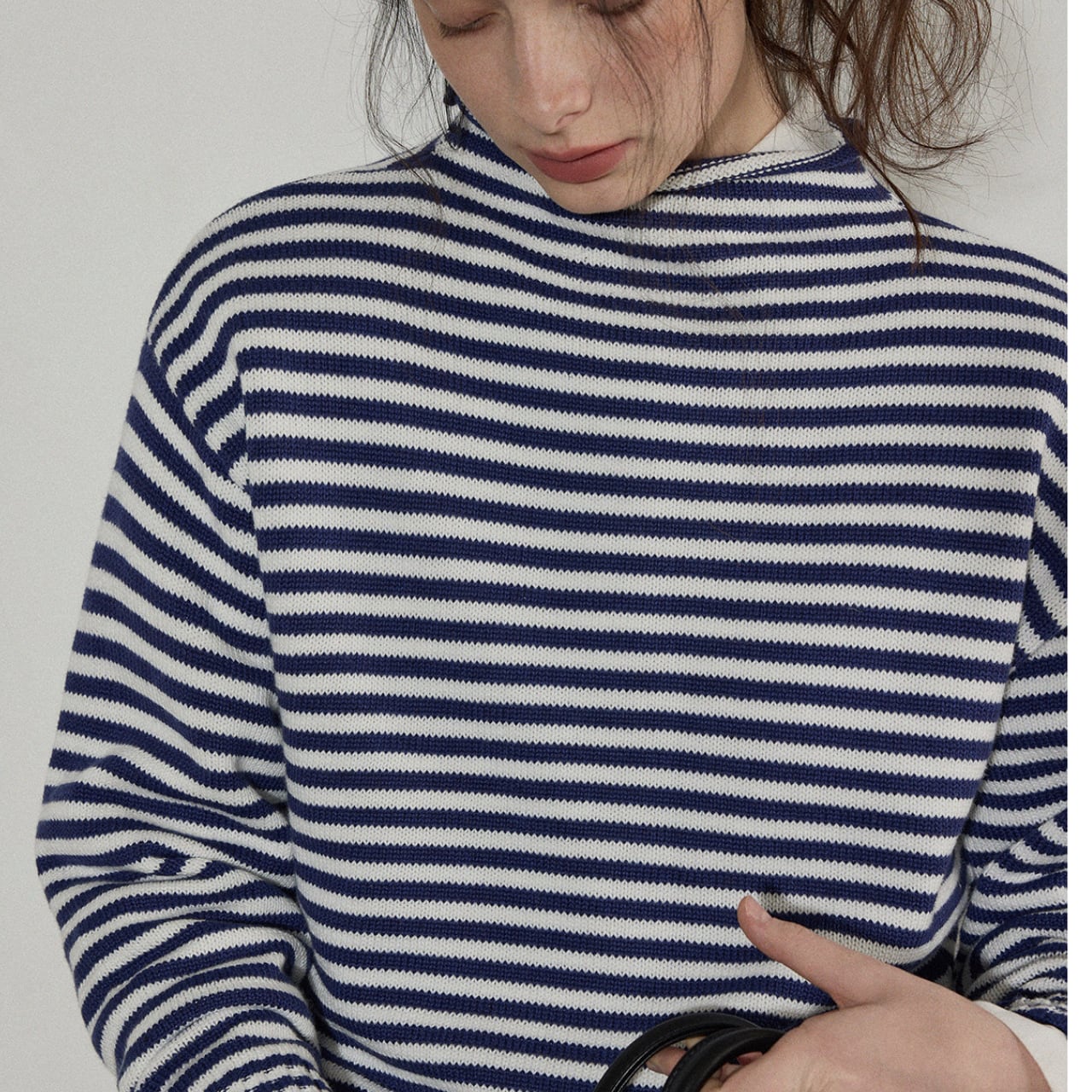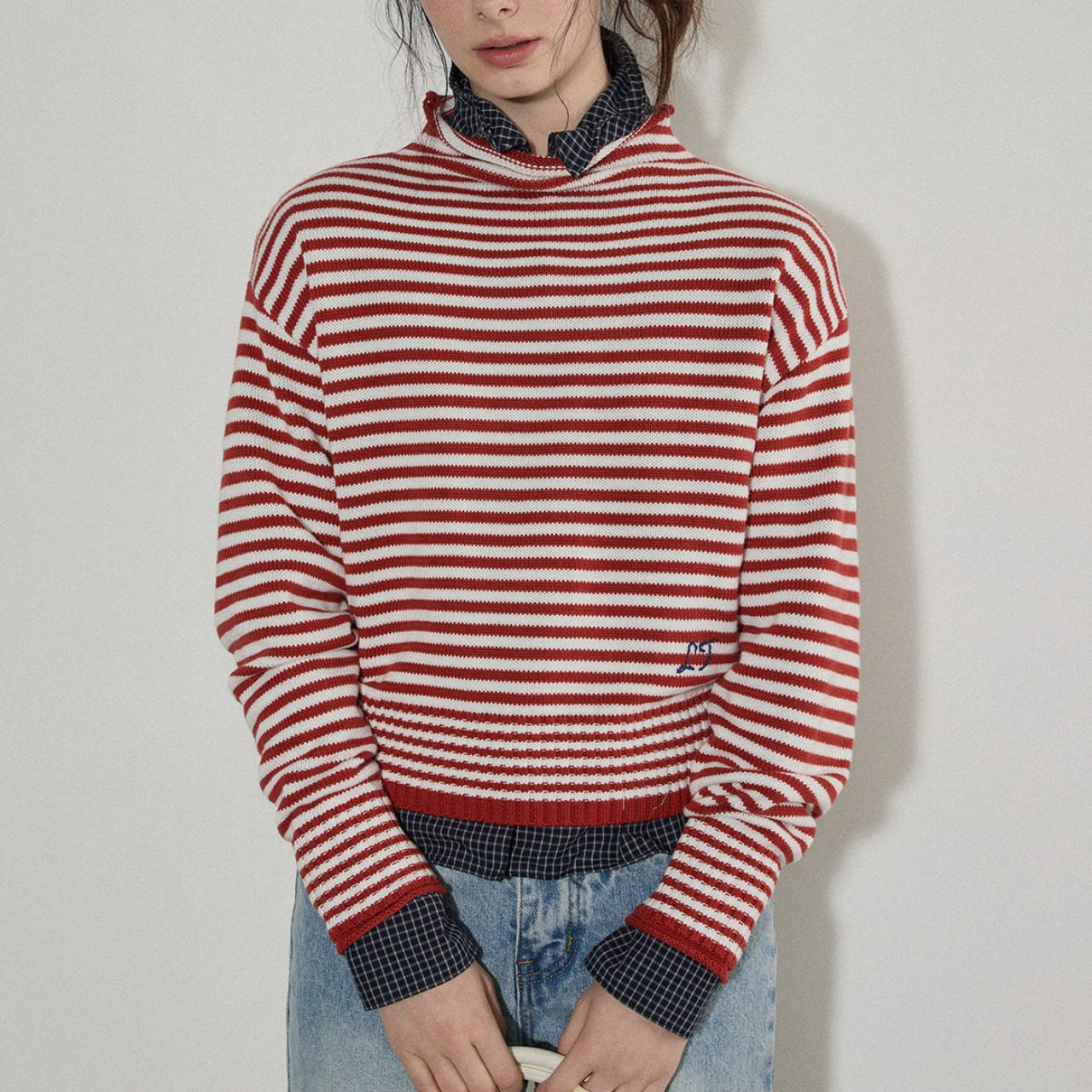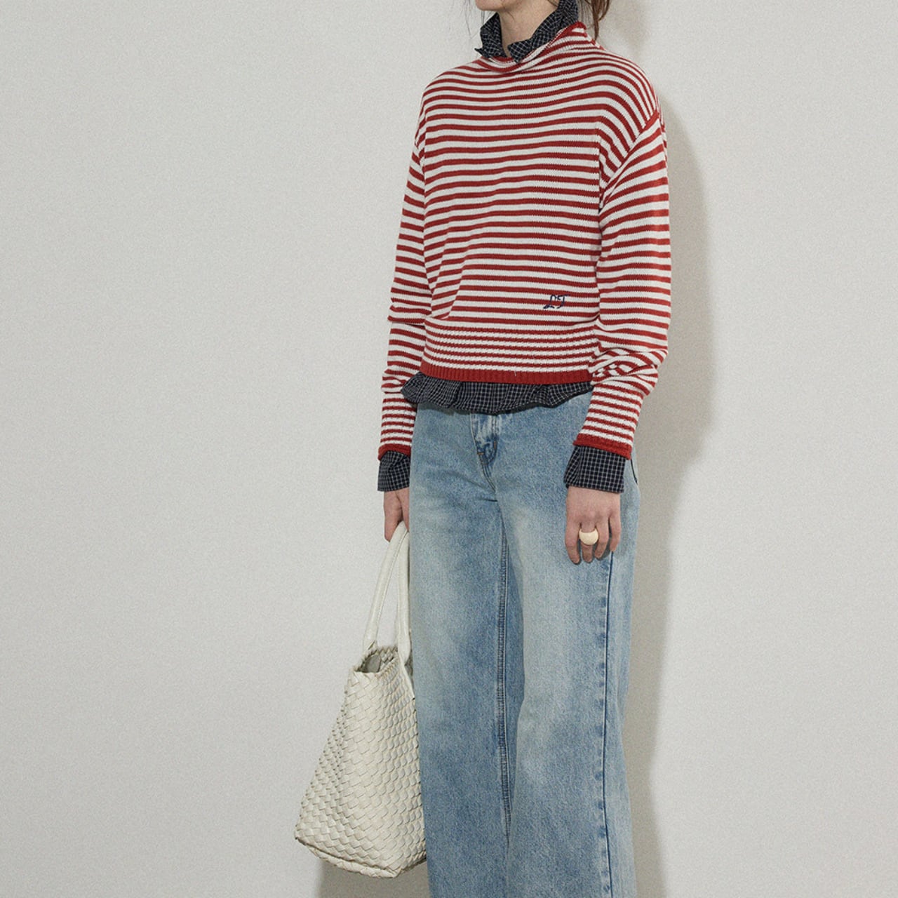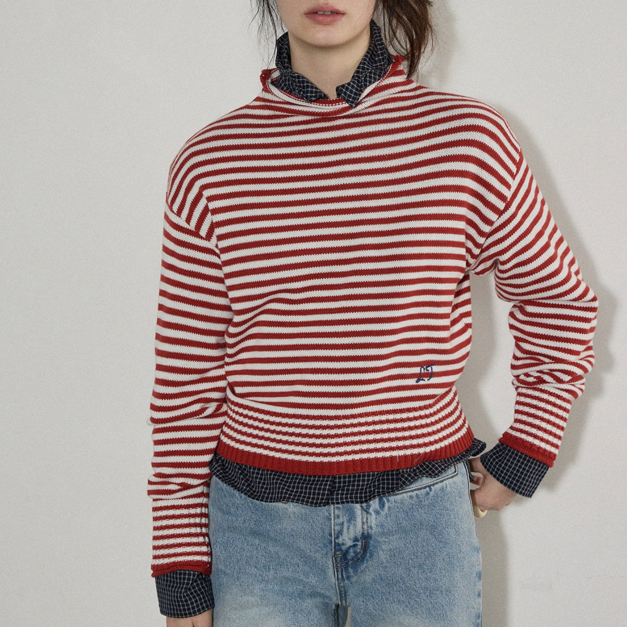 カジュアルな着こなしにぴったりの、ボーダー柄長袖クロップドニット。