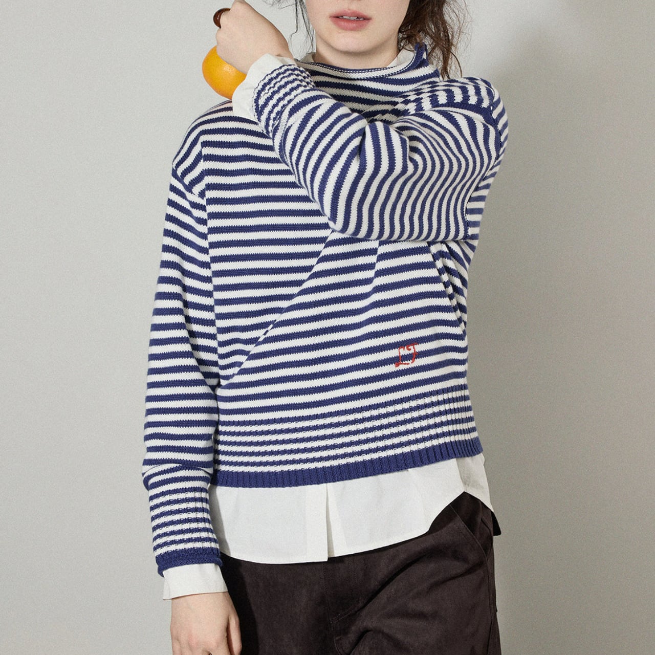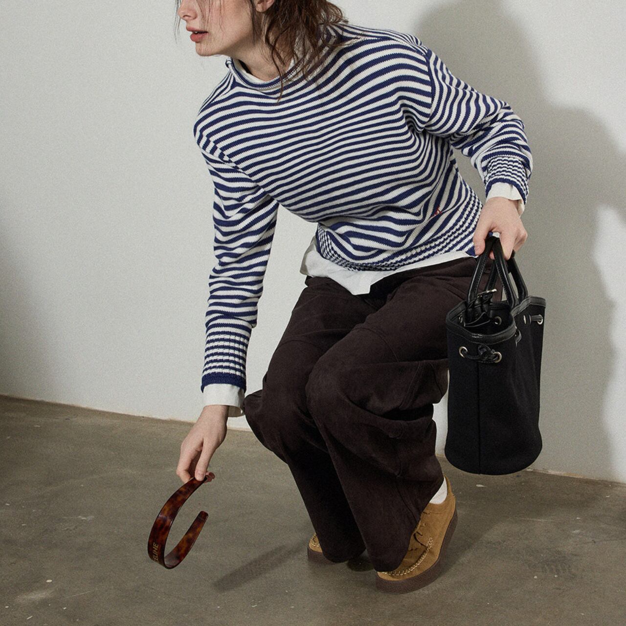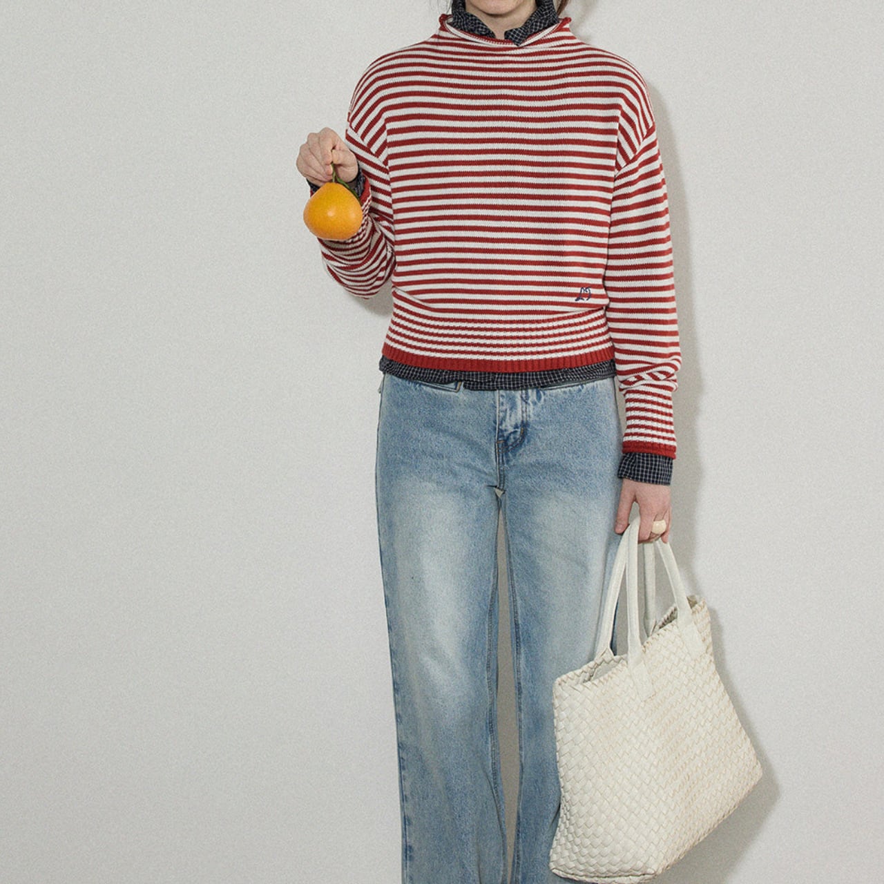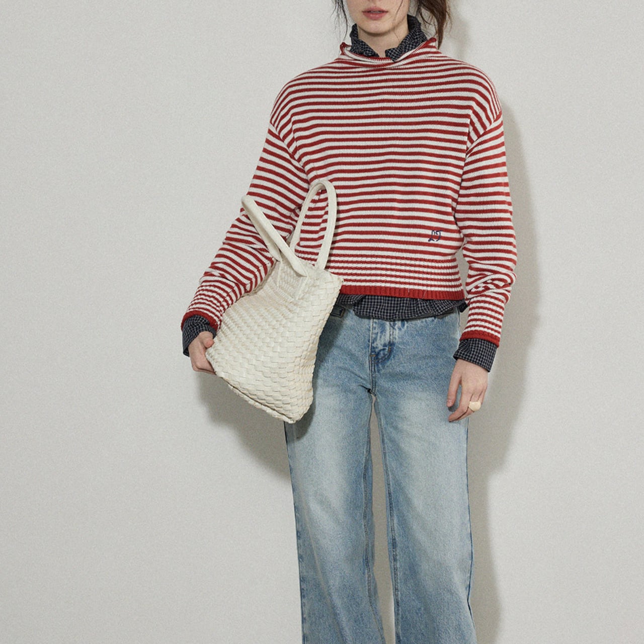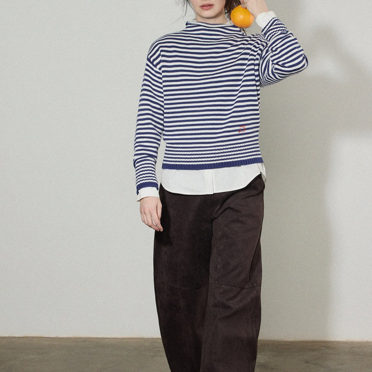 カジュアルな着こなしにぴったりの、ボーダー柄長袖クロップドニット。