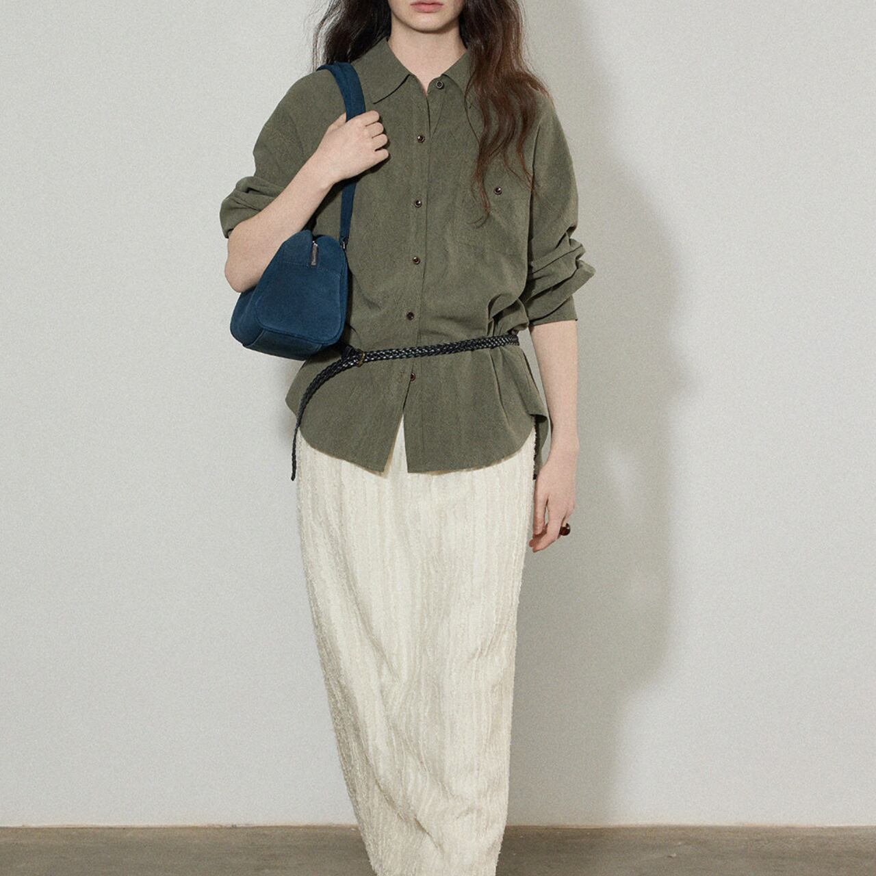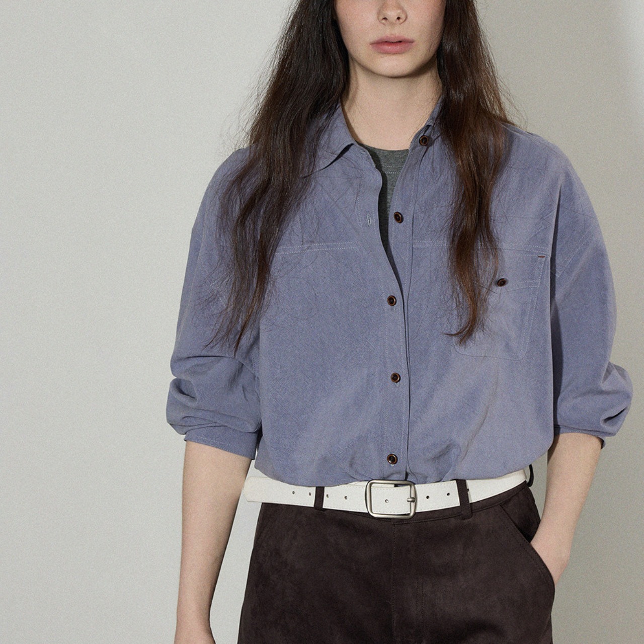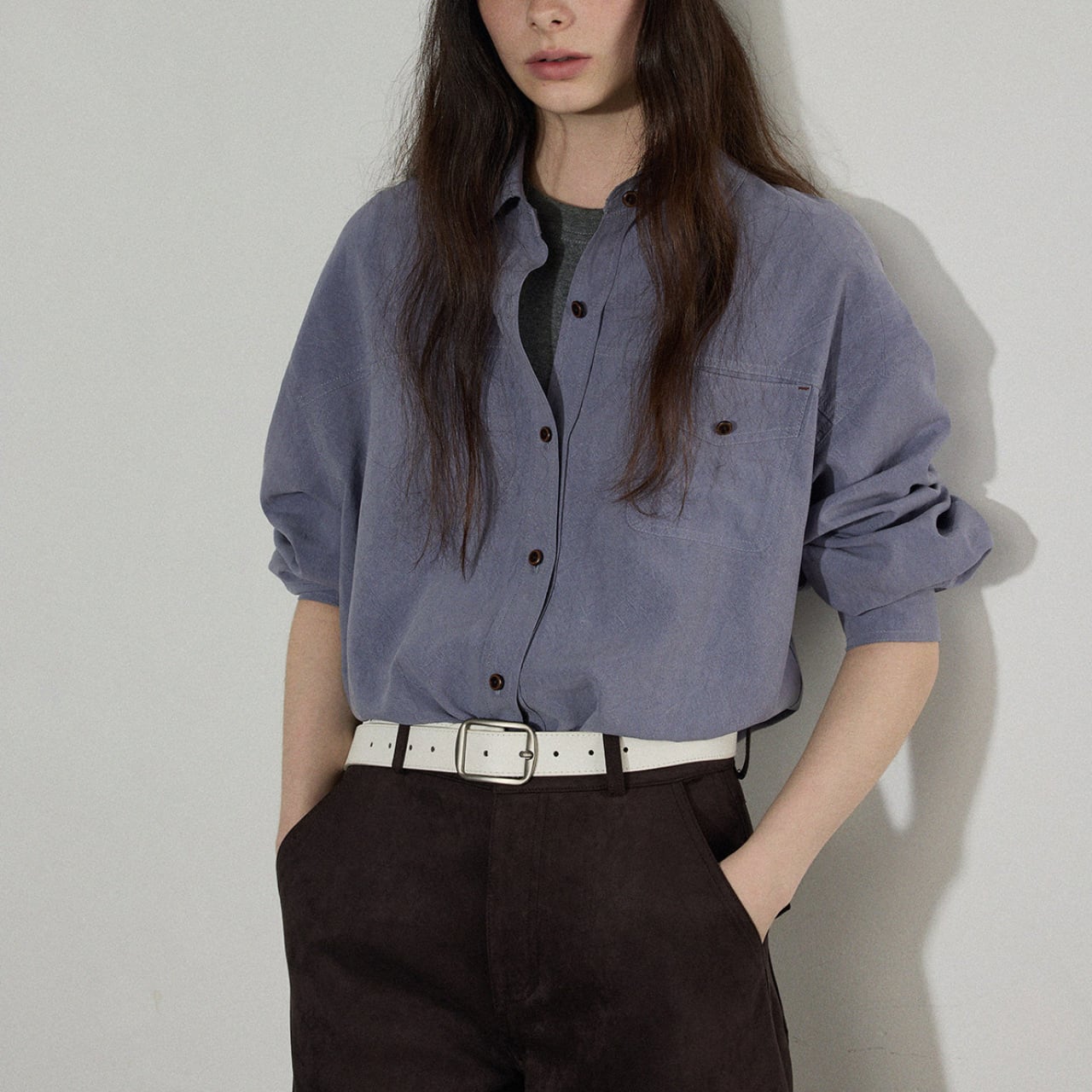 ゆるっとしたサイズ感がこなれた印象をつくる、ニュアンスカラーのルーズシャツ。