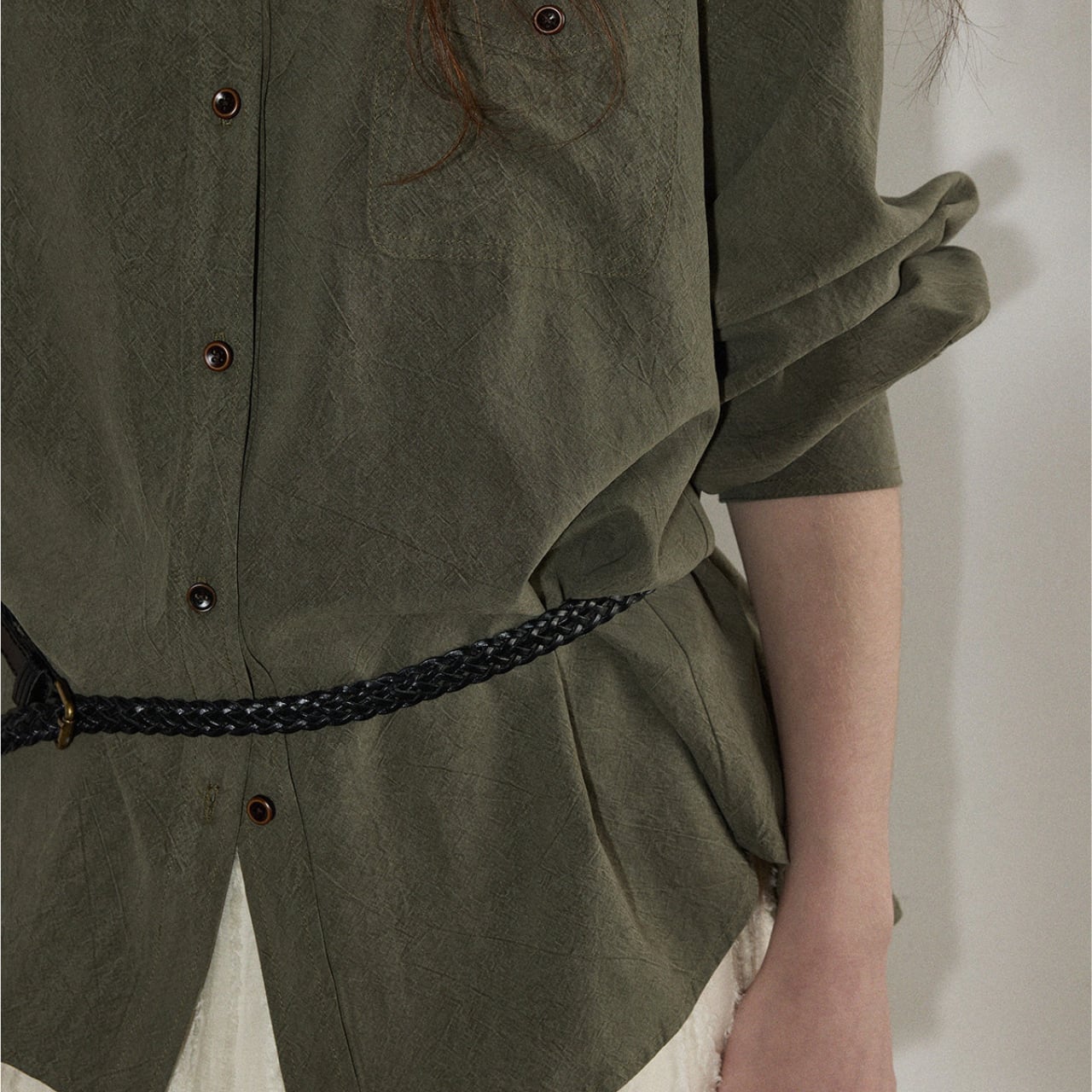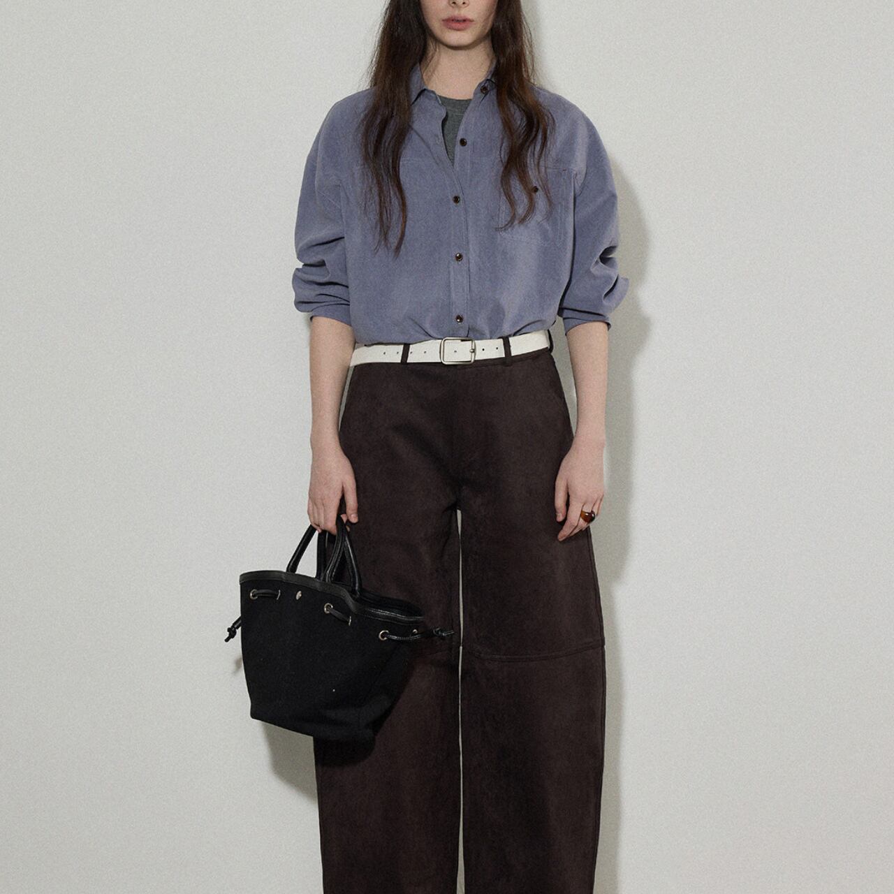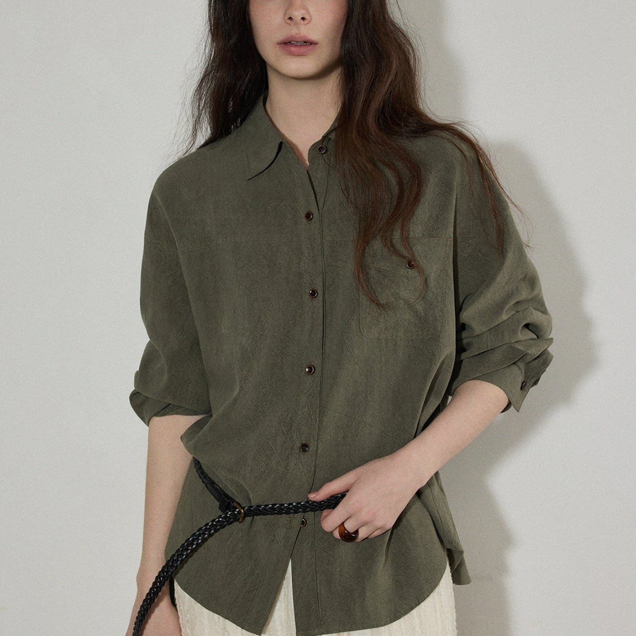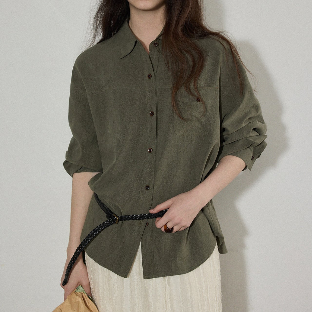 ゆるっとしたサイズ感がこなれた印象をつくる、ニュアンスカラーのルーズシャツ。
