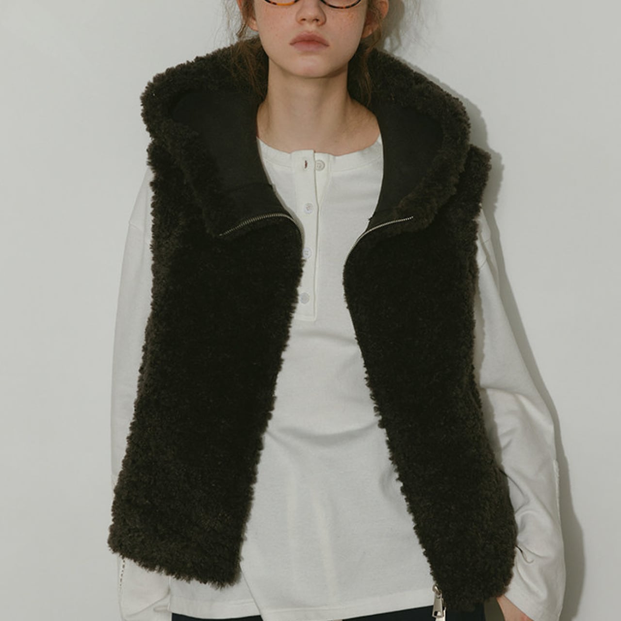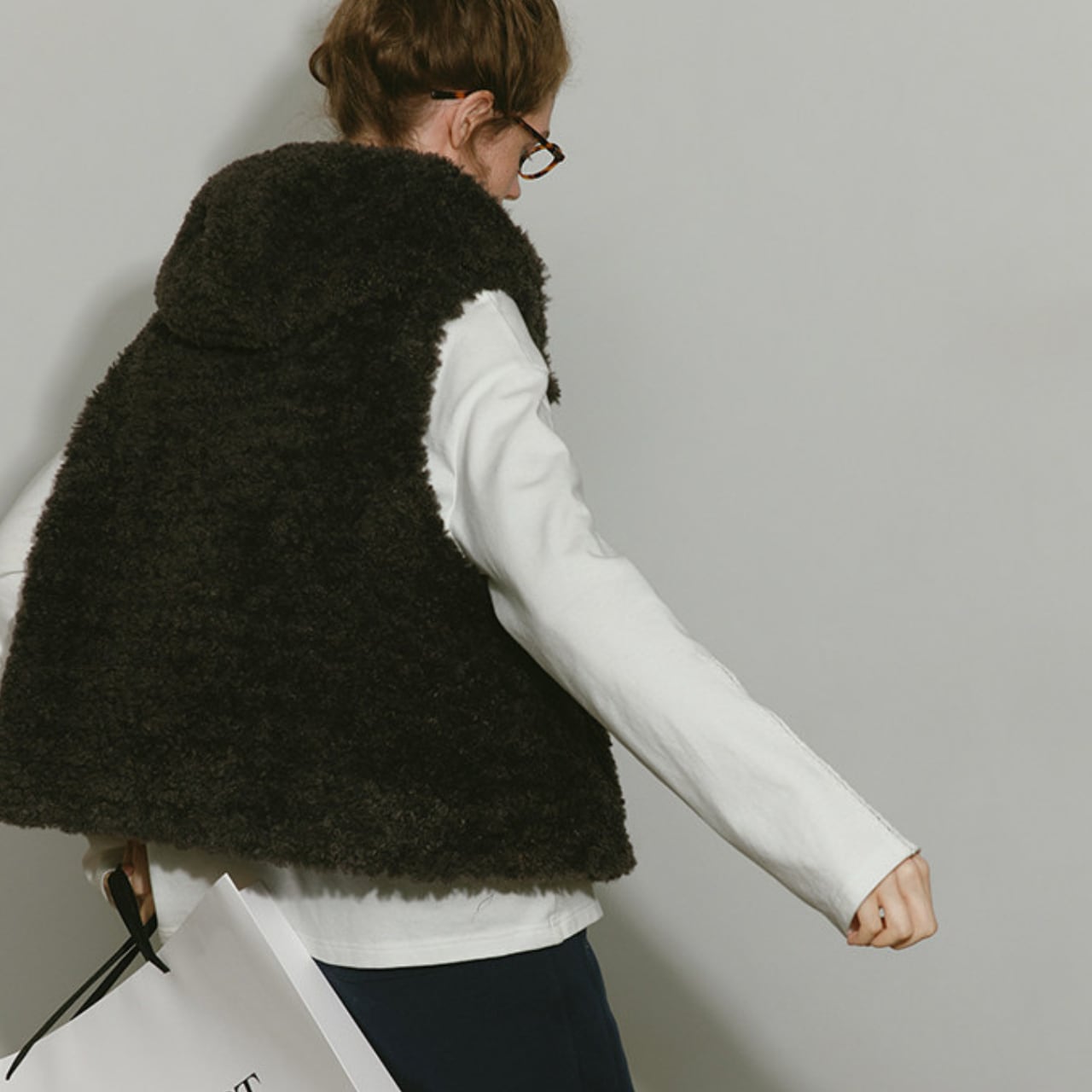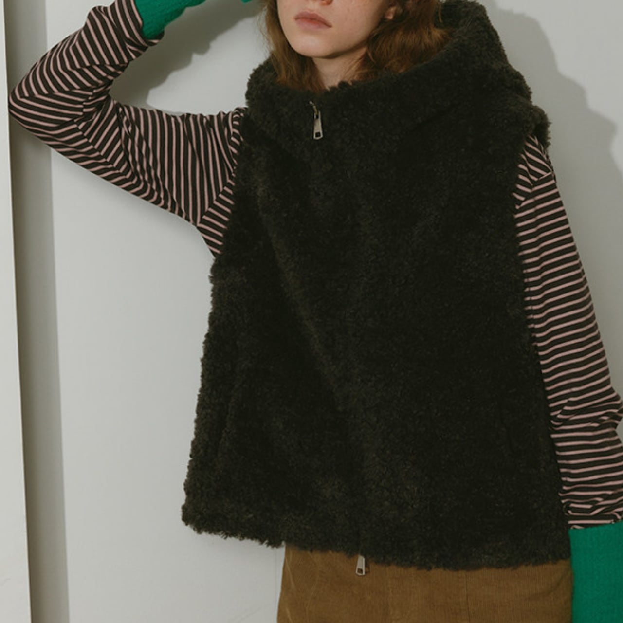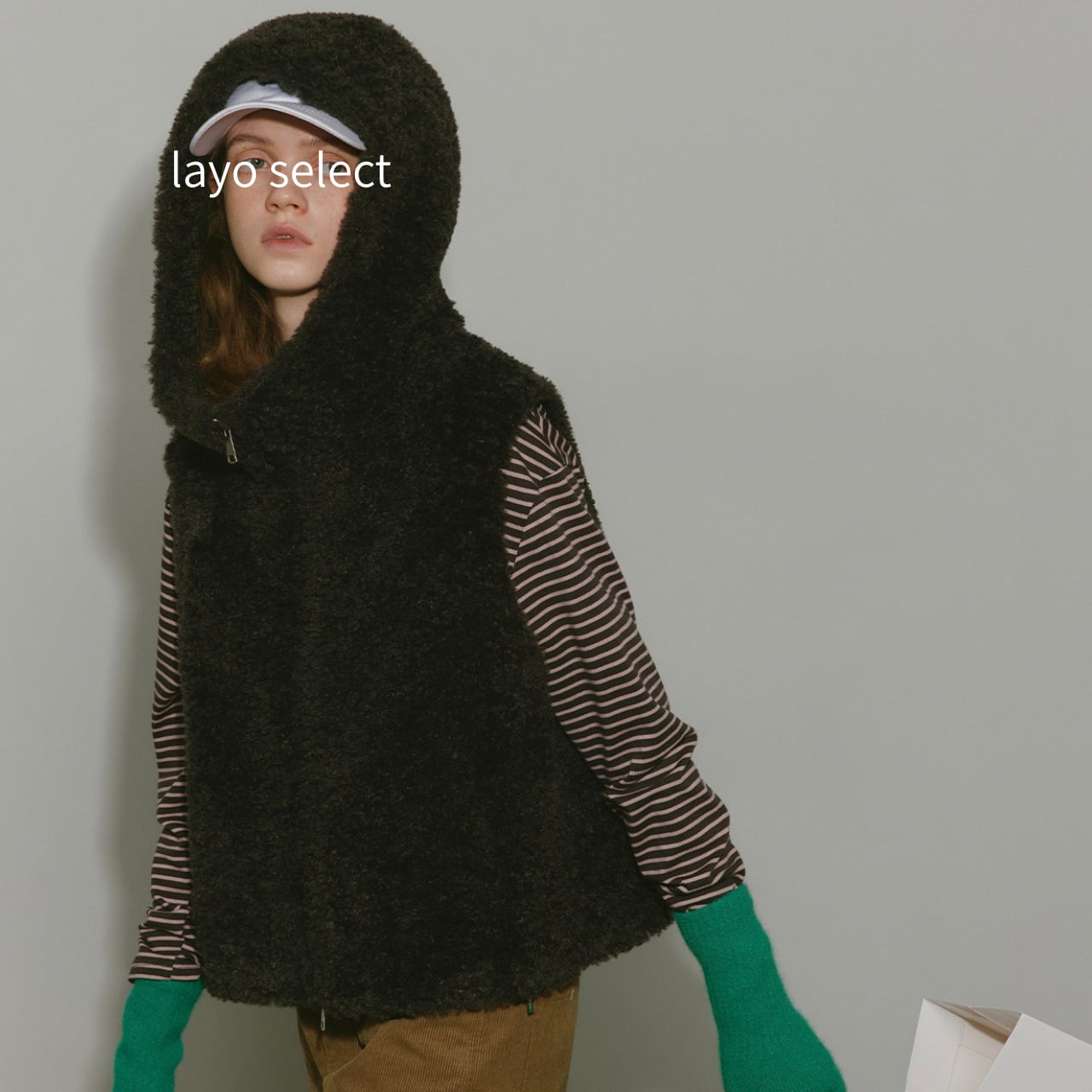 ふんわりとしたボア素材が季節感たっぷりのフード付きベスト。
