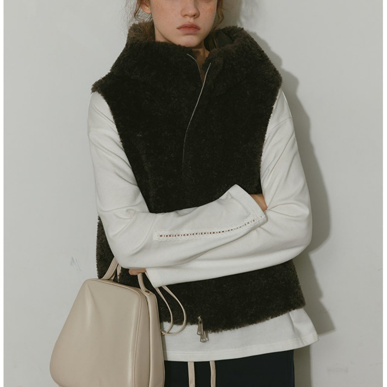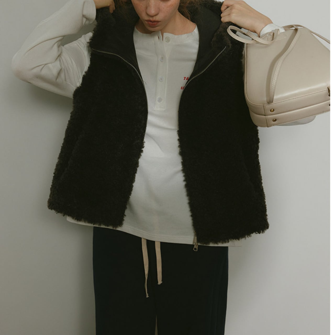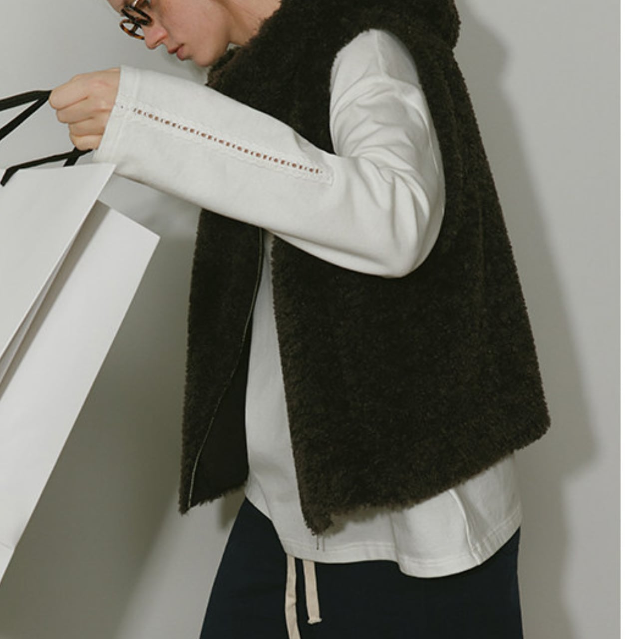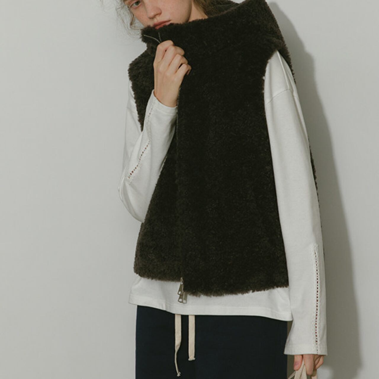 ふんわりとしたボア素材が季節感たっぷりのフード付きベスト。