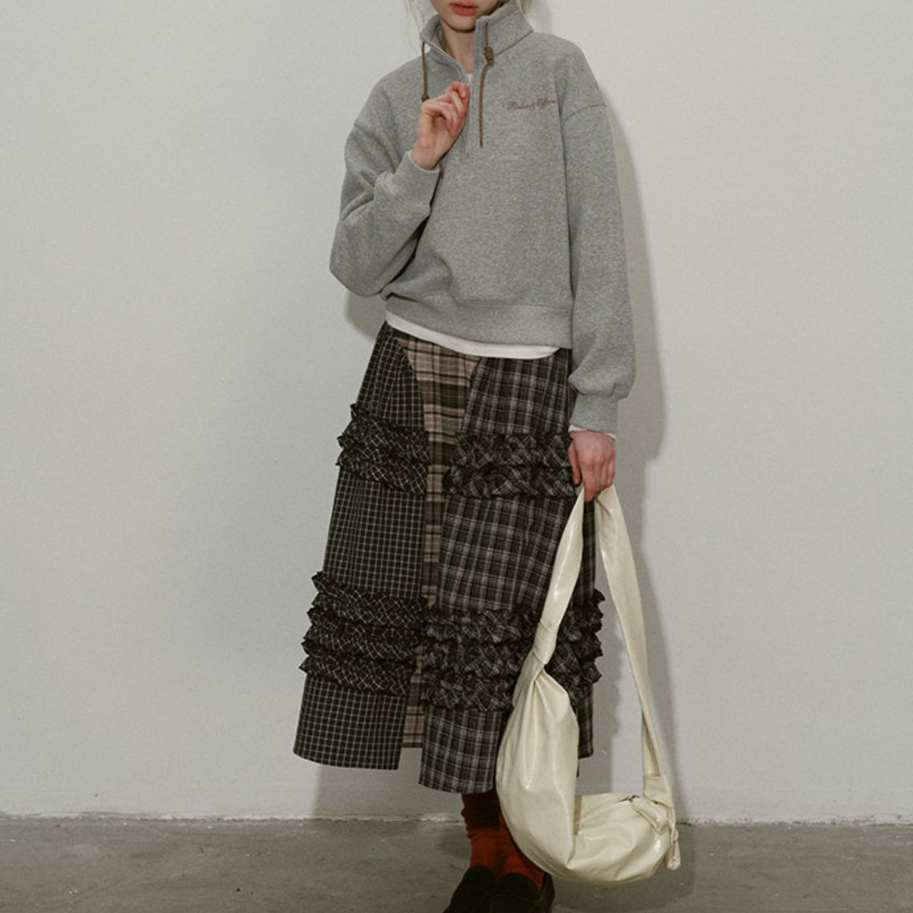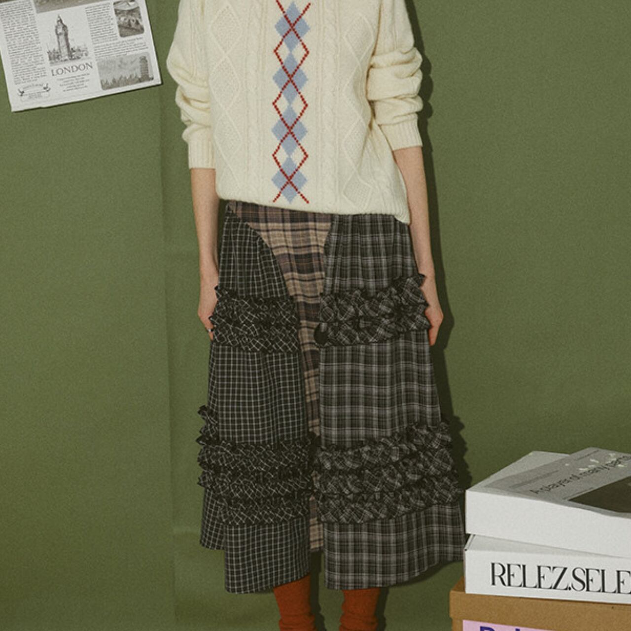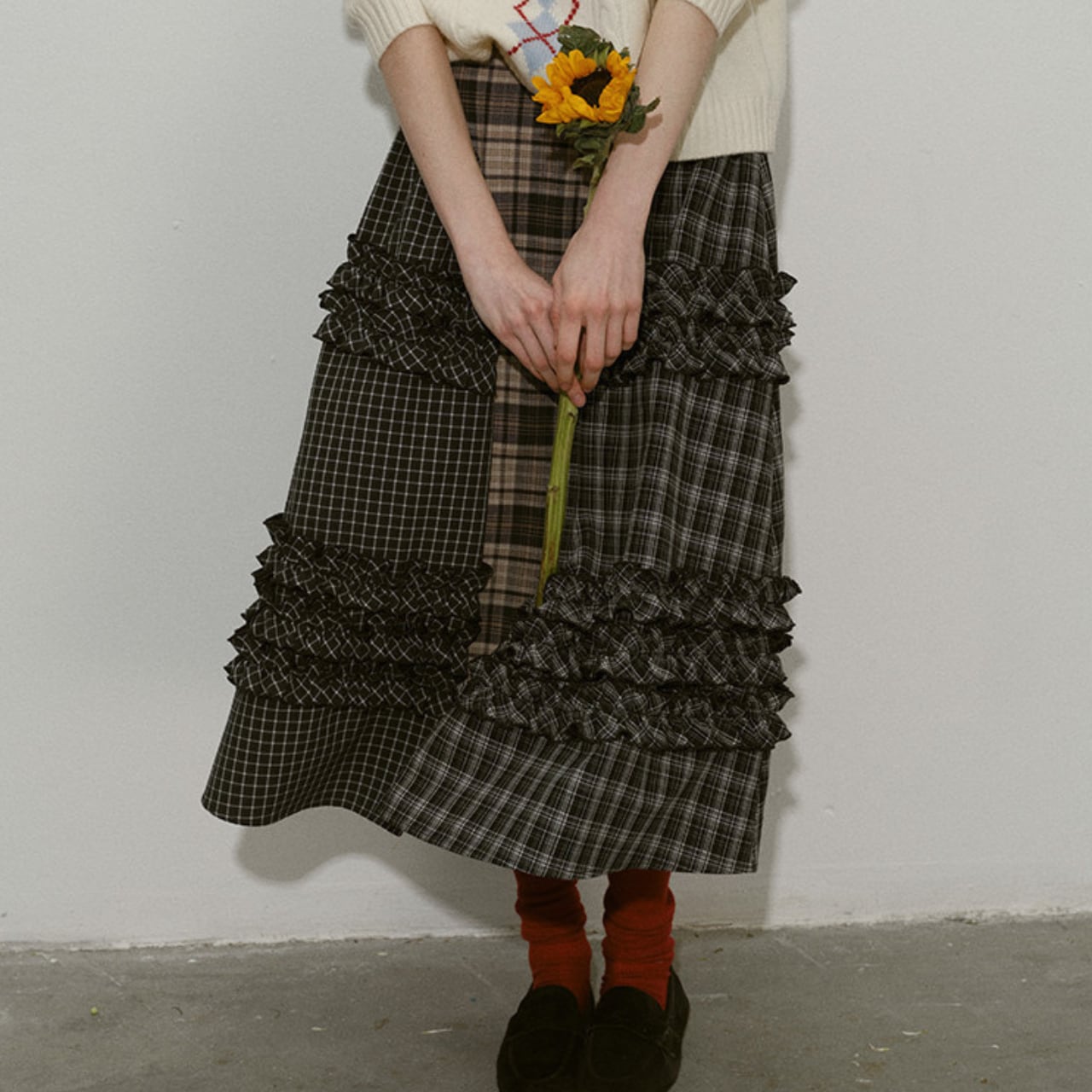 異なるチェック柄を組み合わせたパッチワークデザインが目を惹くティアードスカート。