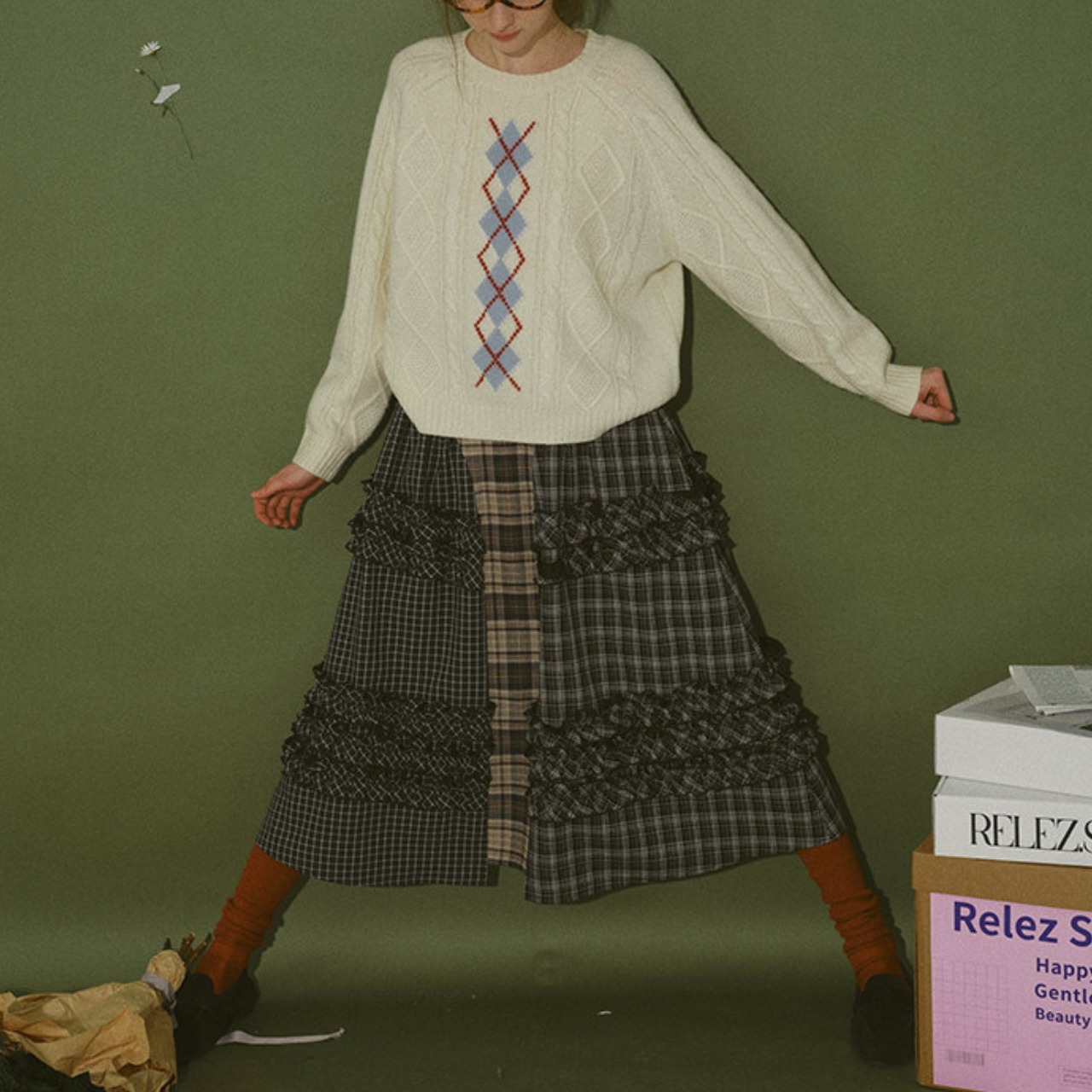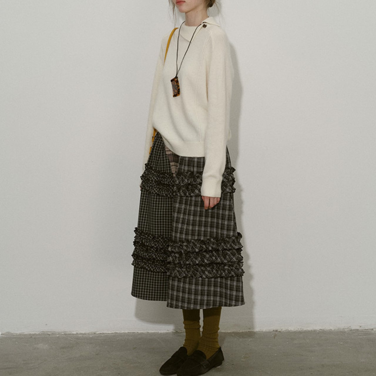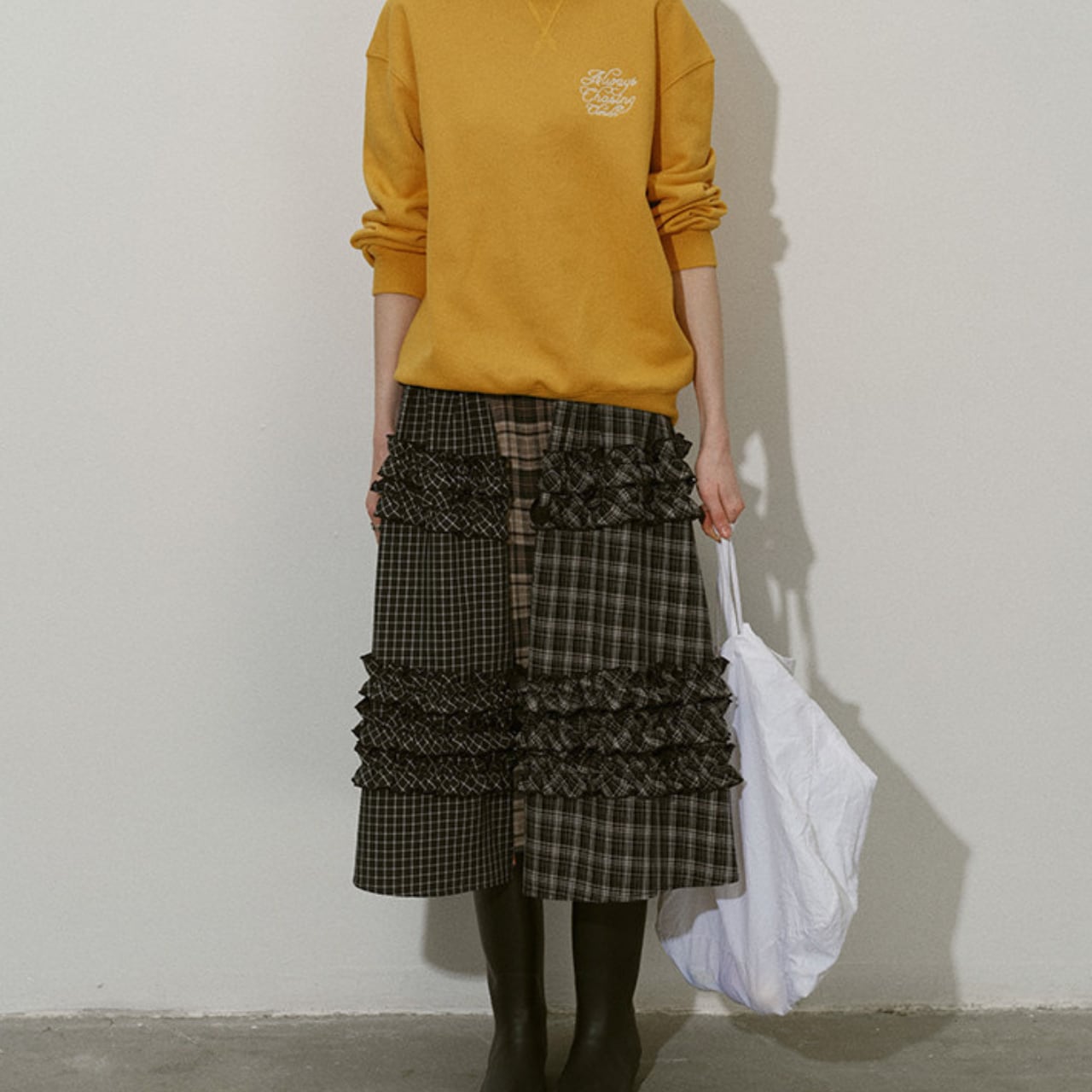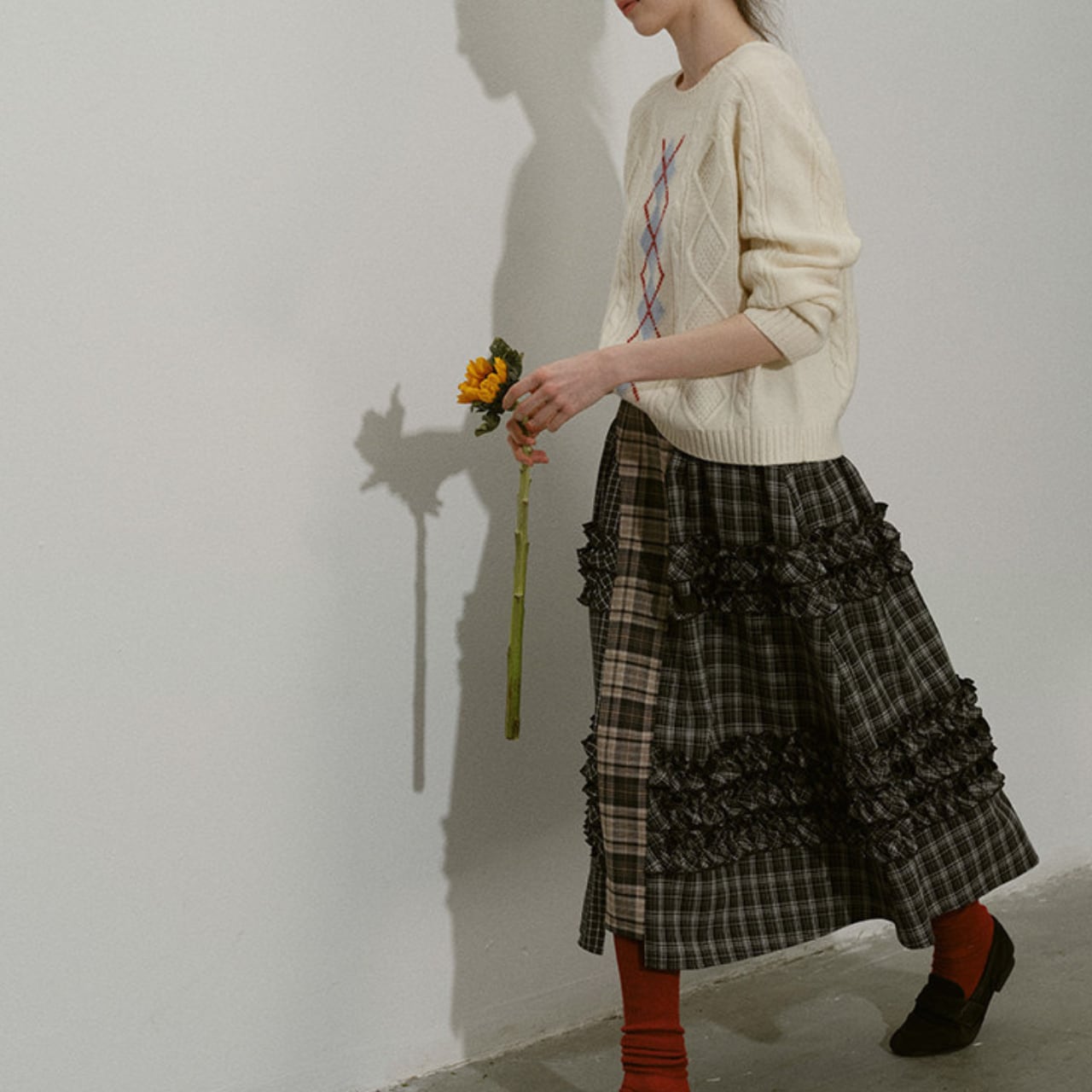 異なるチェック柄を組み合わせたパッチワークデザインが目を惹くティアードスカート。