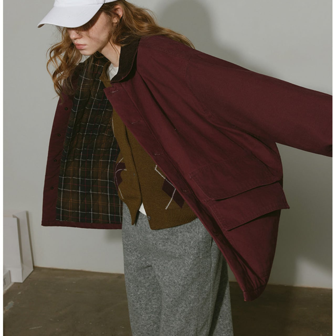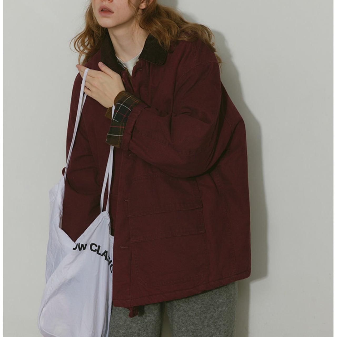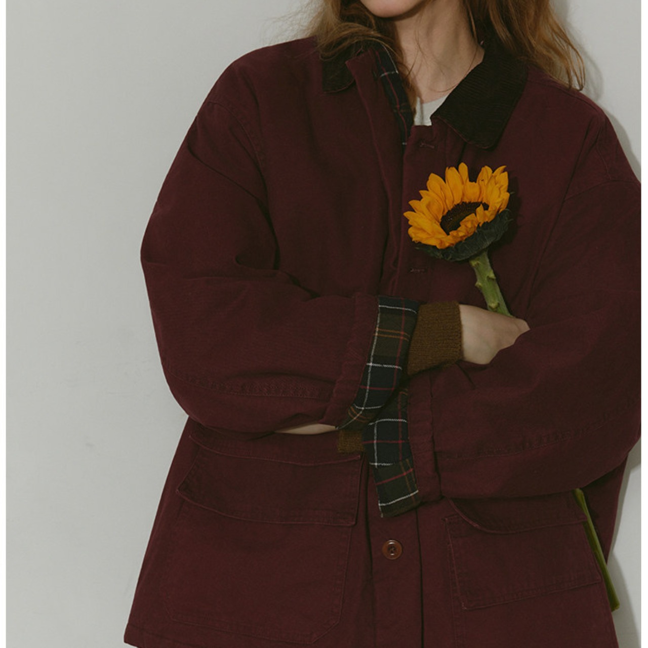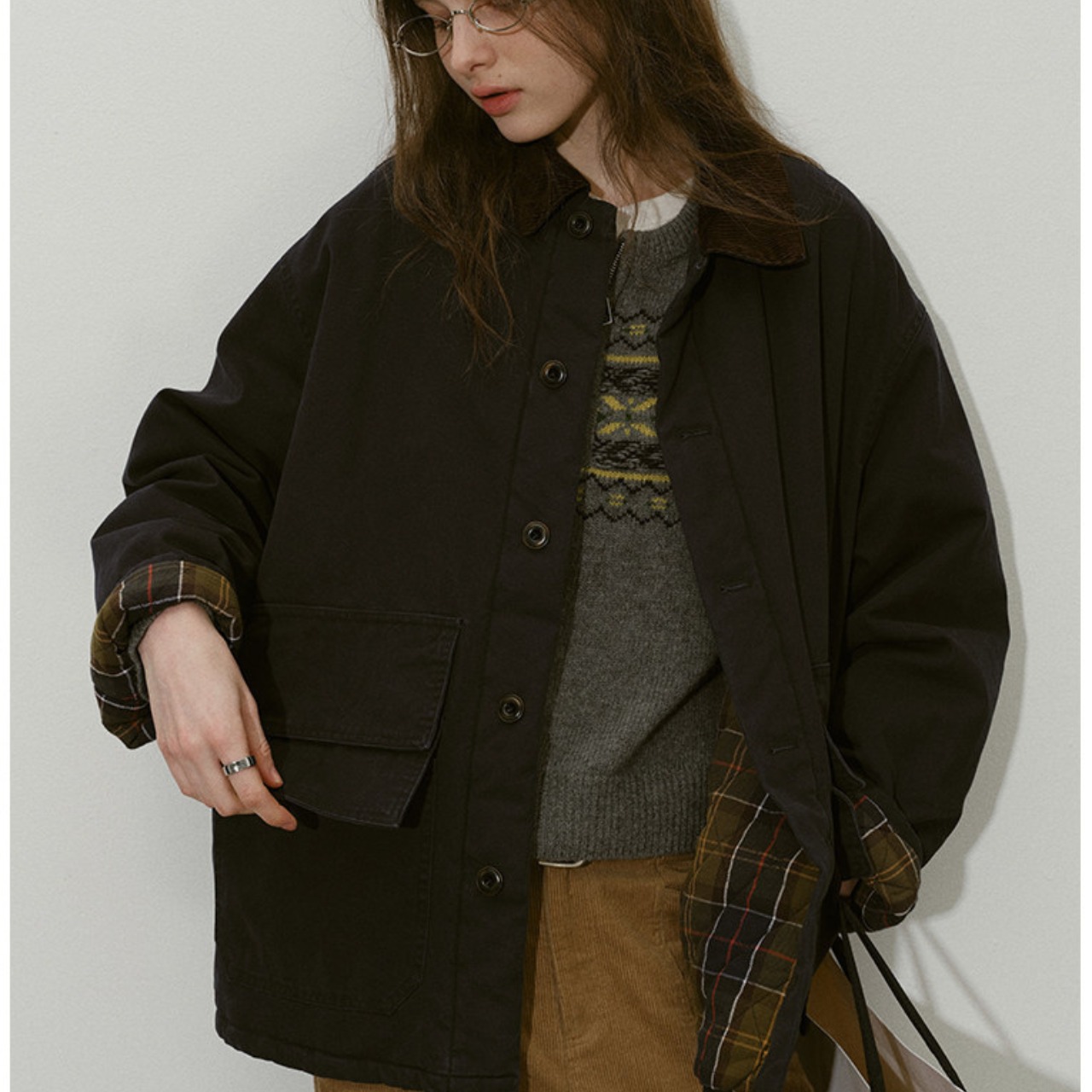 コーデュロイ襟がアクセントになった、ワークテイストのジャケット。