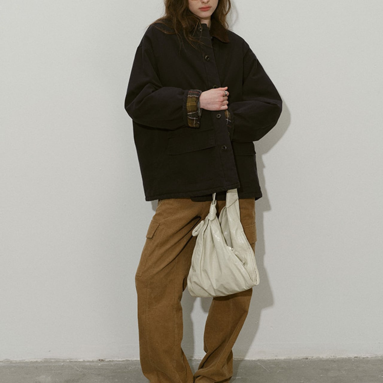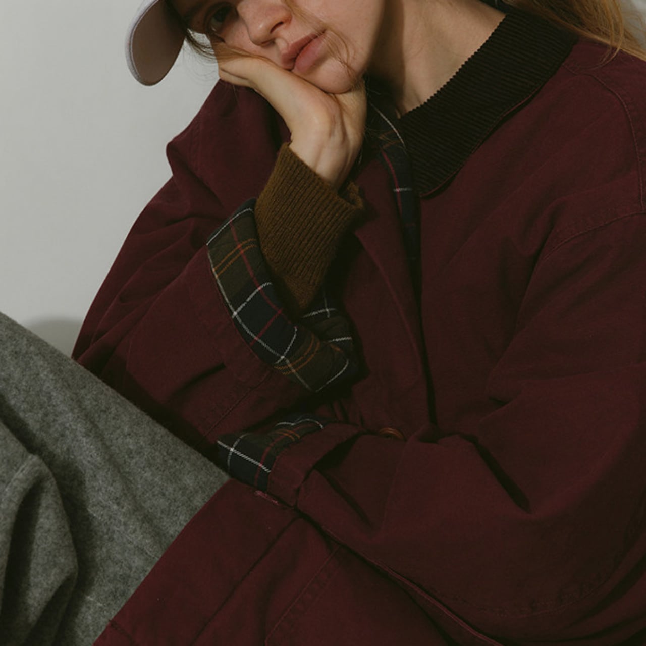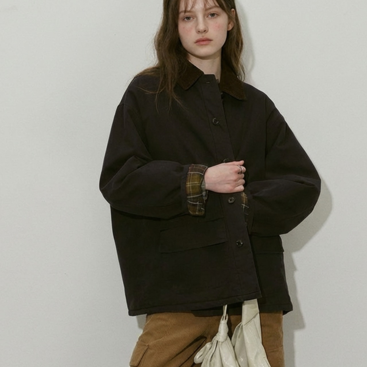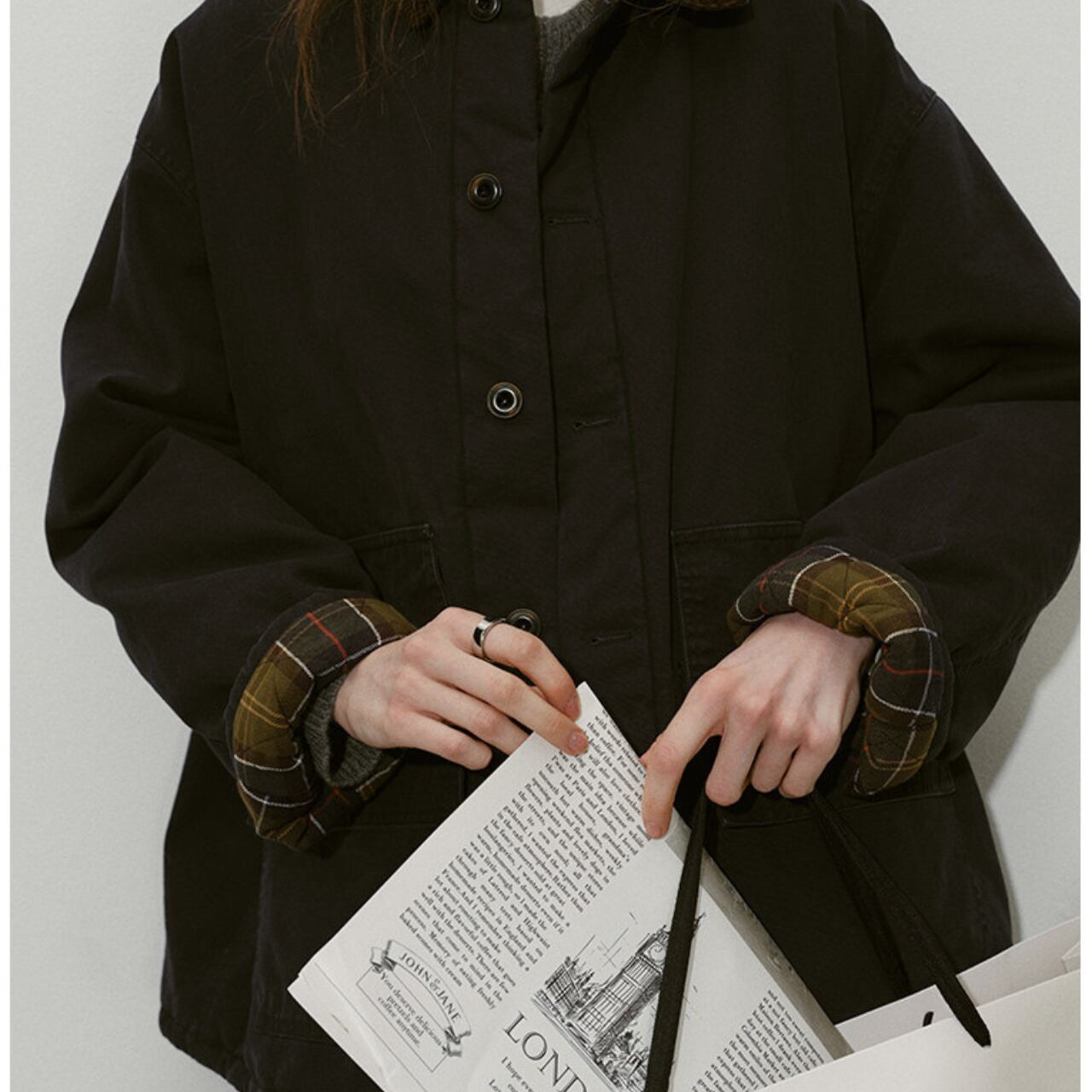 コーデュロイ襟がアクセントになった、ワークテイストのジャケット。