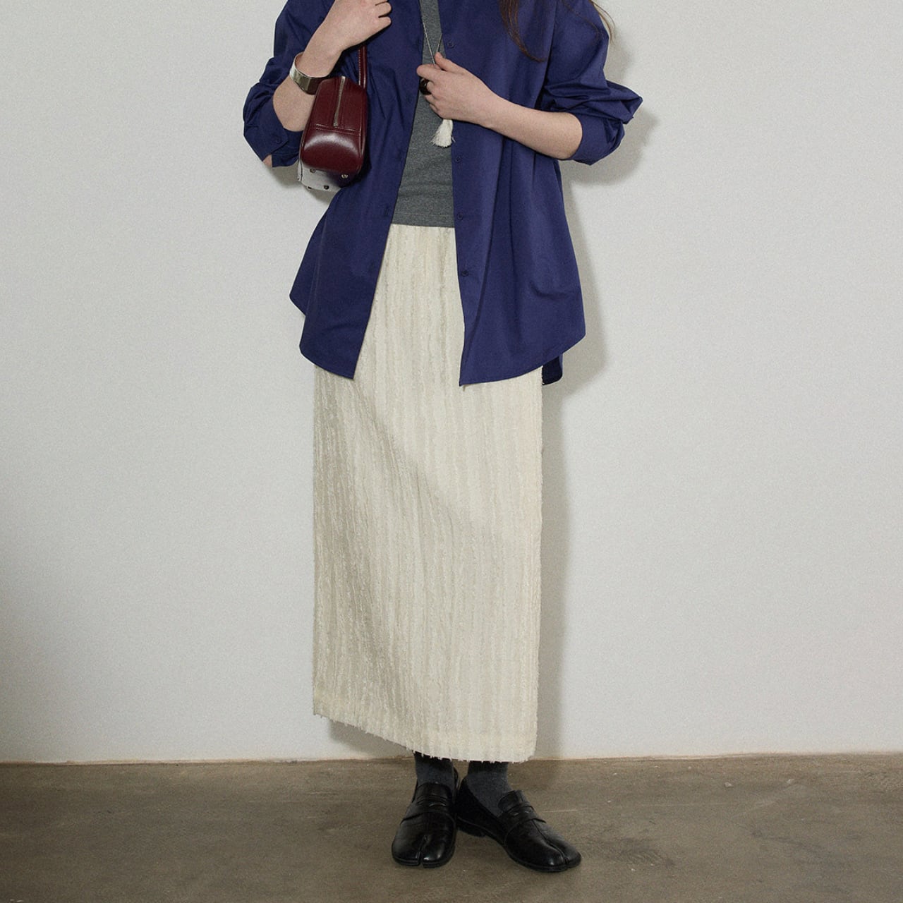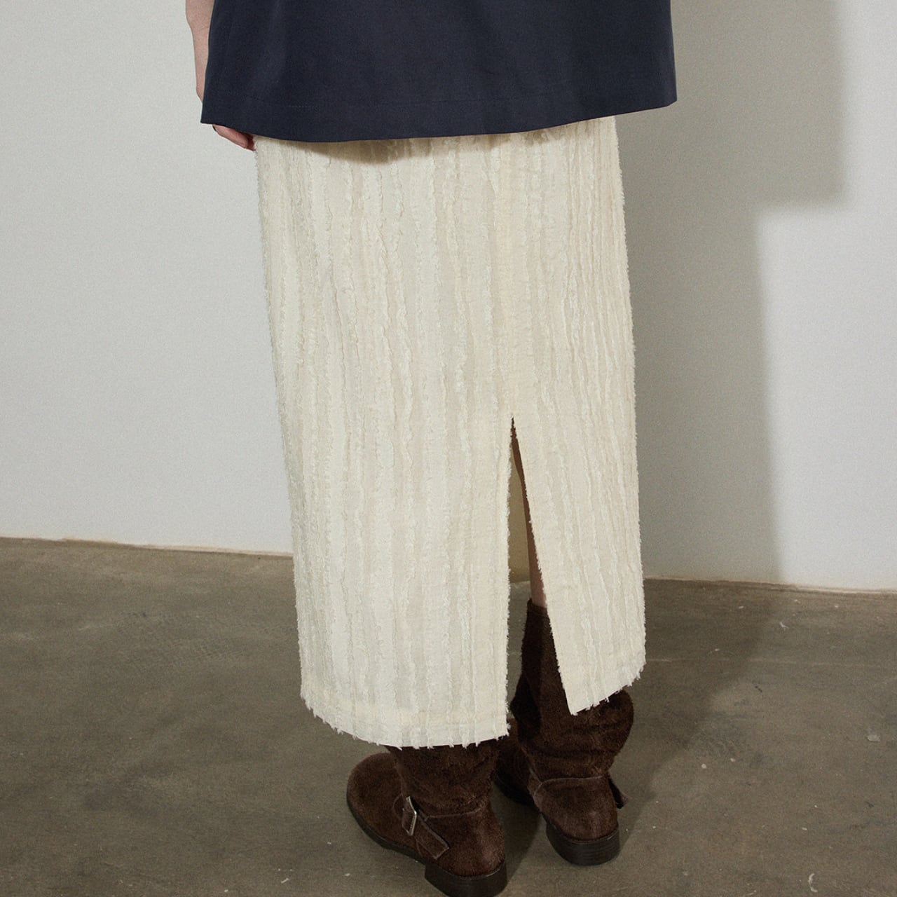 バックスリットがさりげない抜け感を演出するミディ丈タイトスカート。