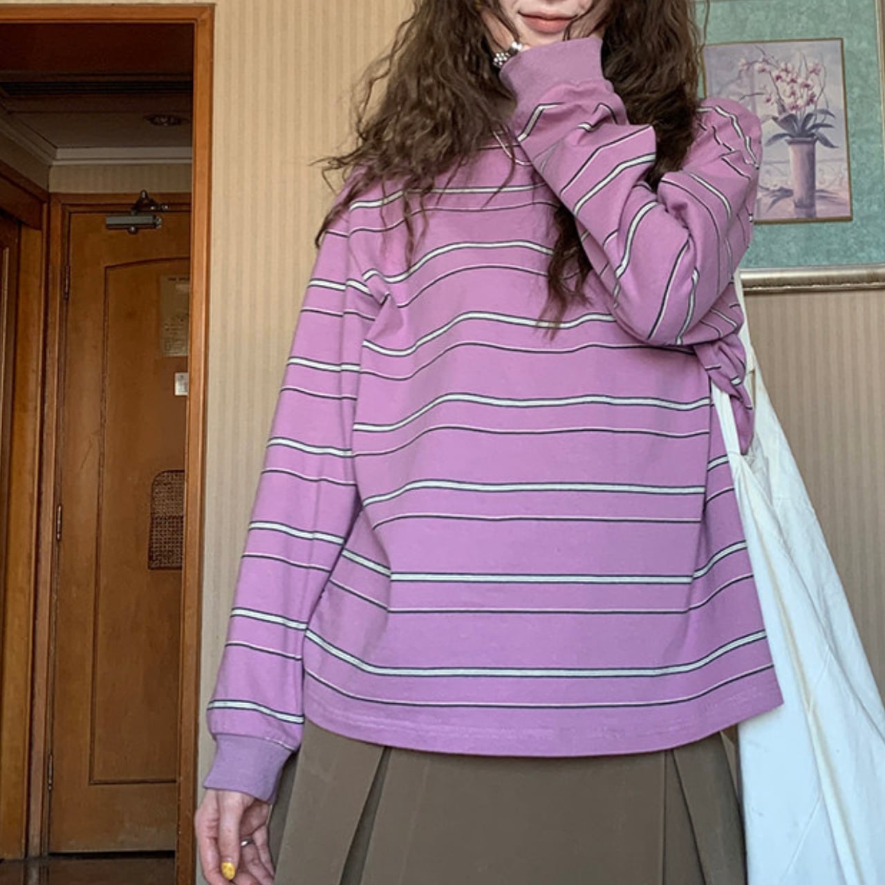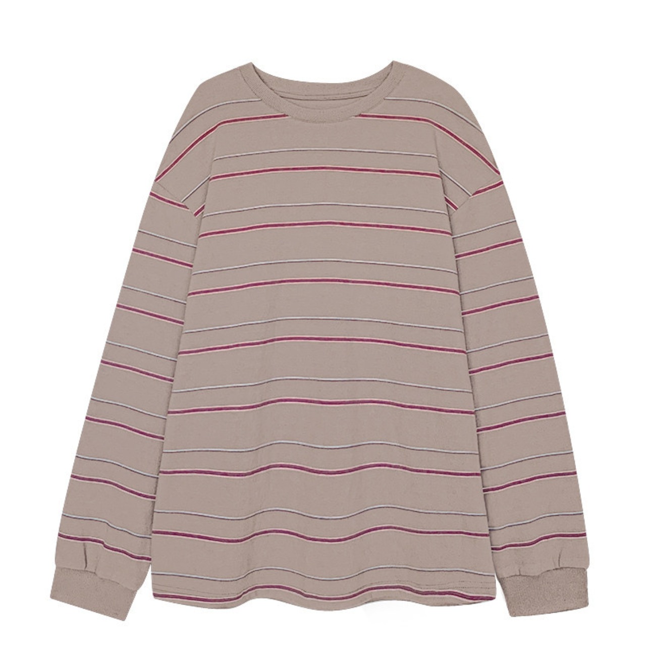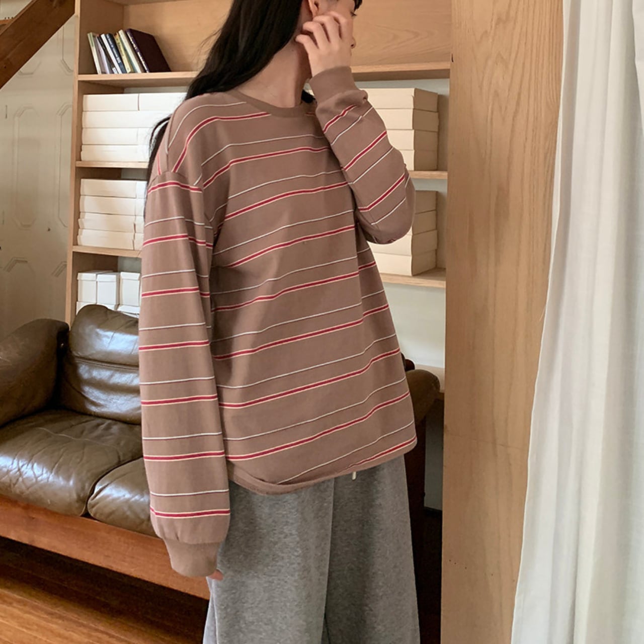 落ち着いた色合いのボーダー柄は、コーディネートに取り入れやすく、様々なスタイルに合わせやすい一枚です。