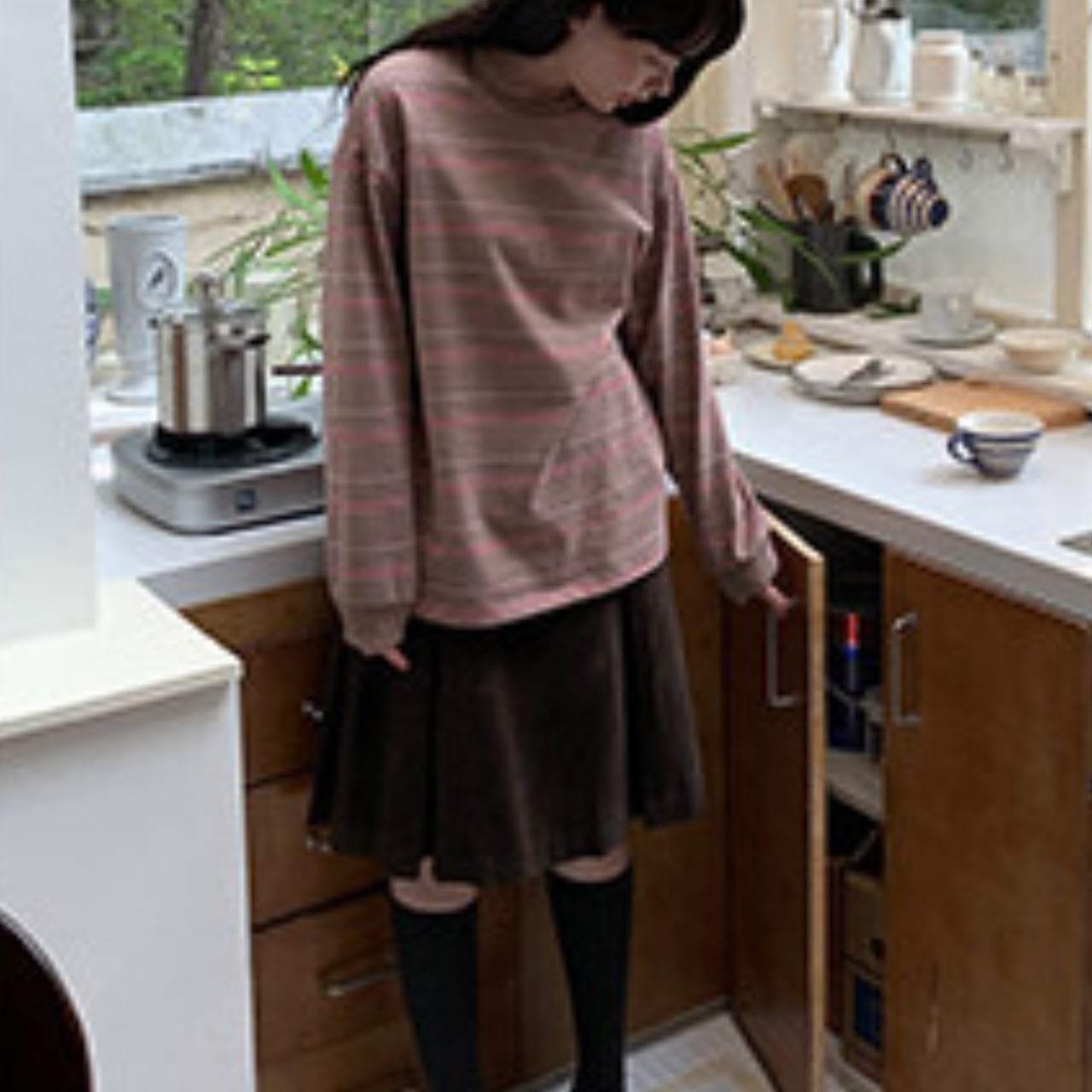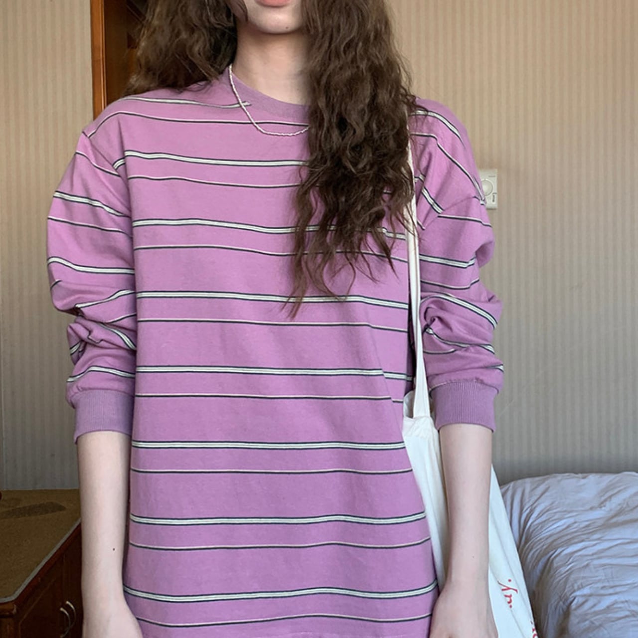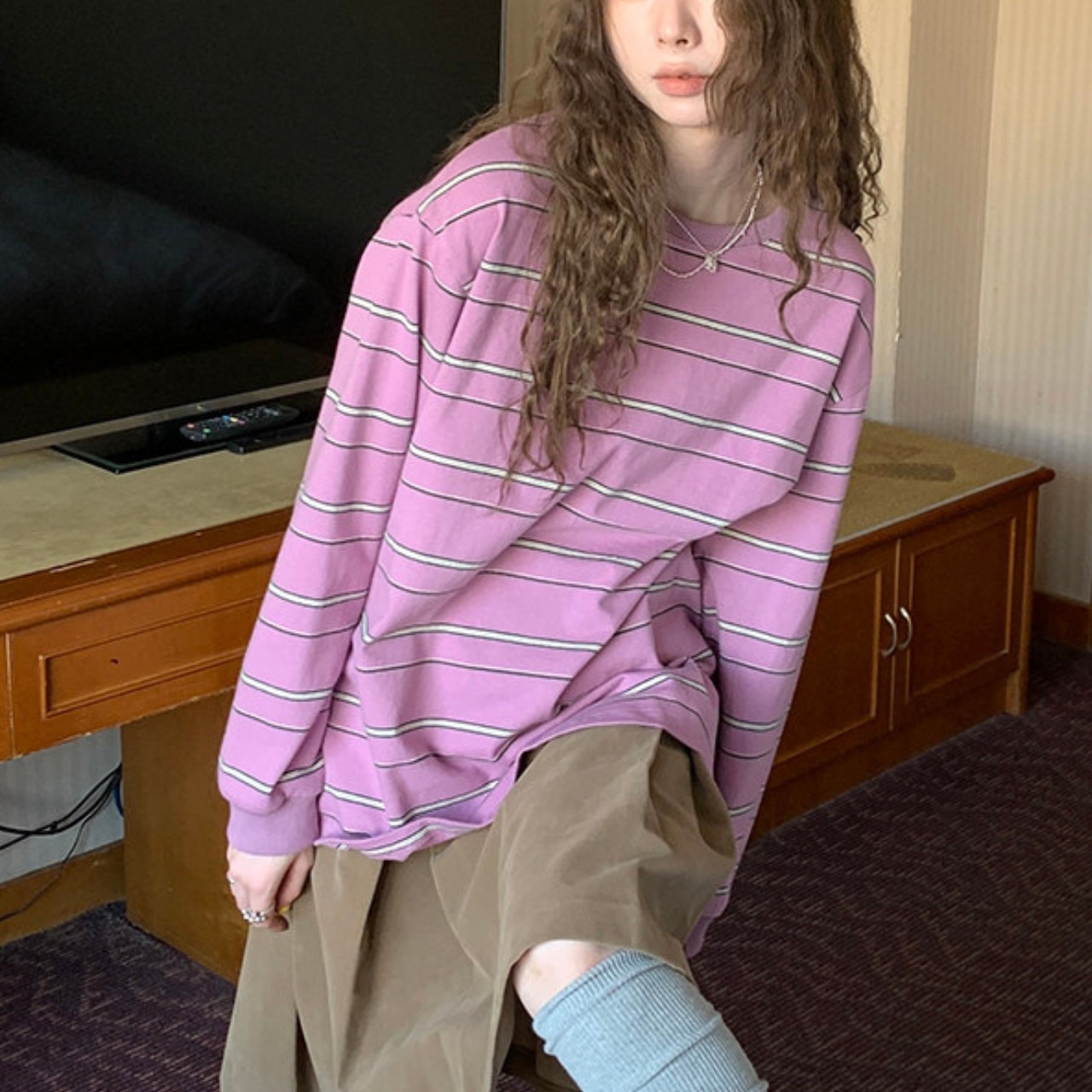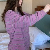 落ち着いた色合いのボーダー柄は、コーディネートに取り入れやすく、様々なスタイルに合わせやすい一枚です。