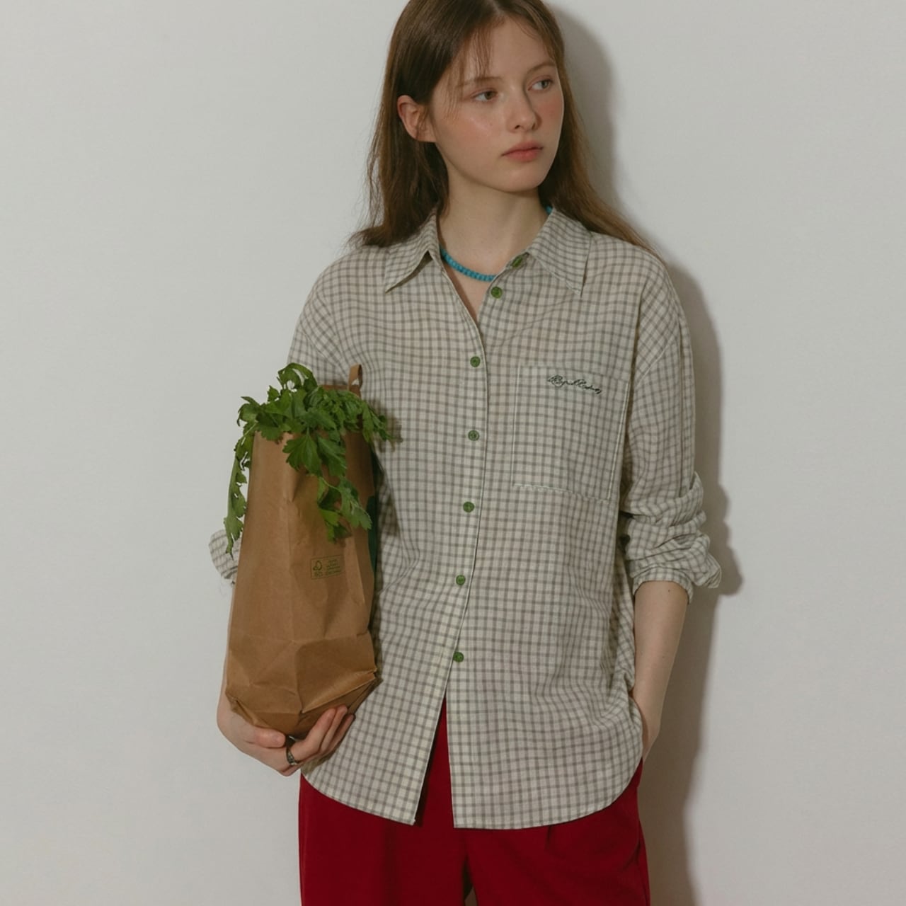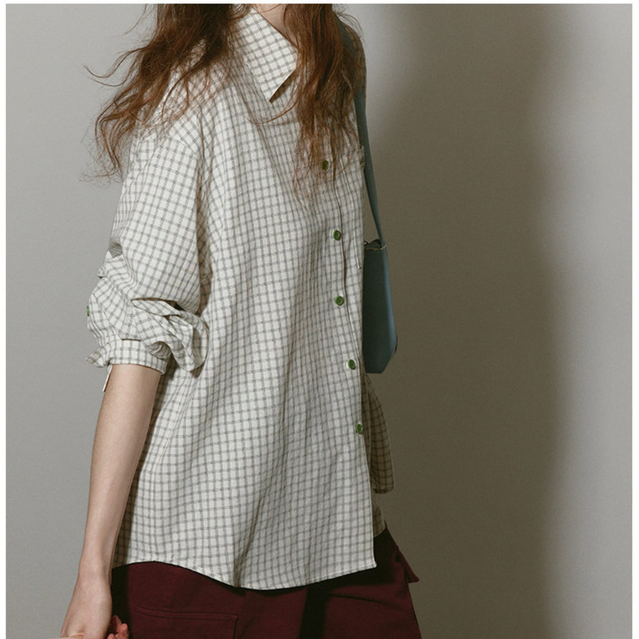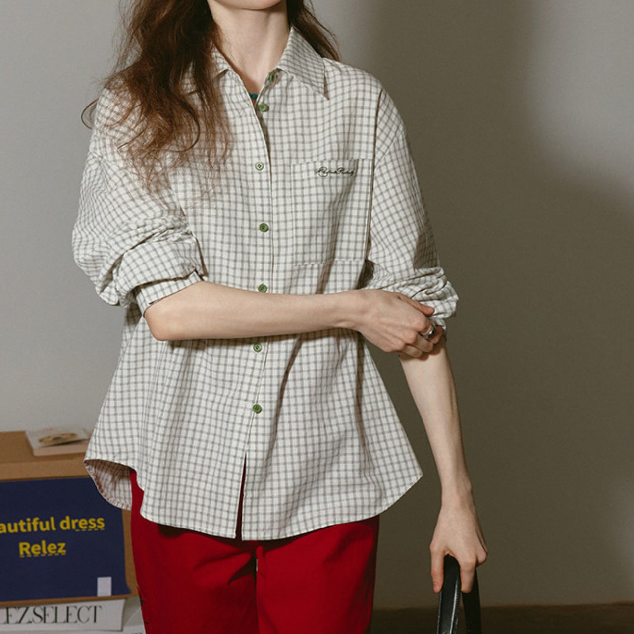 チェック柄がコーディネートにアクセントを加え、カジュアルながらも洗練された印象を与えます。