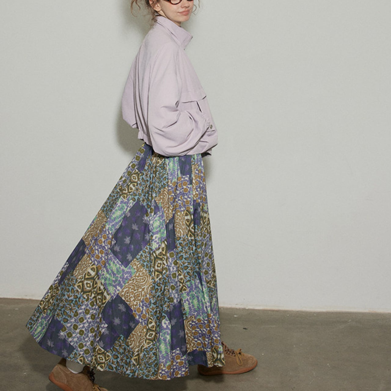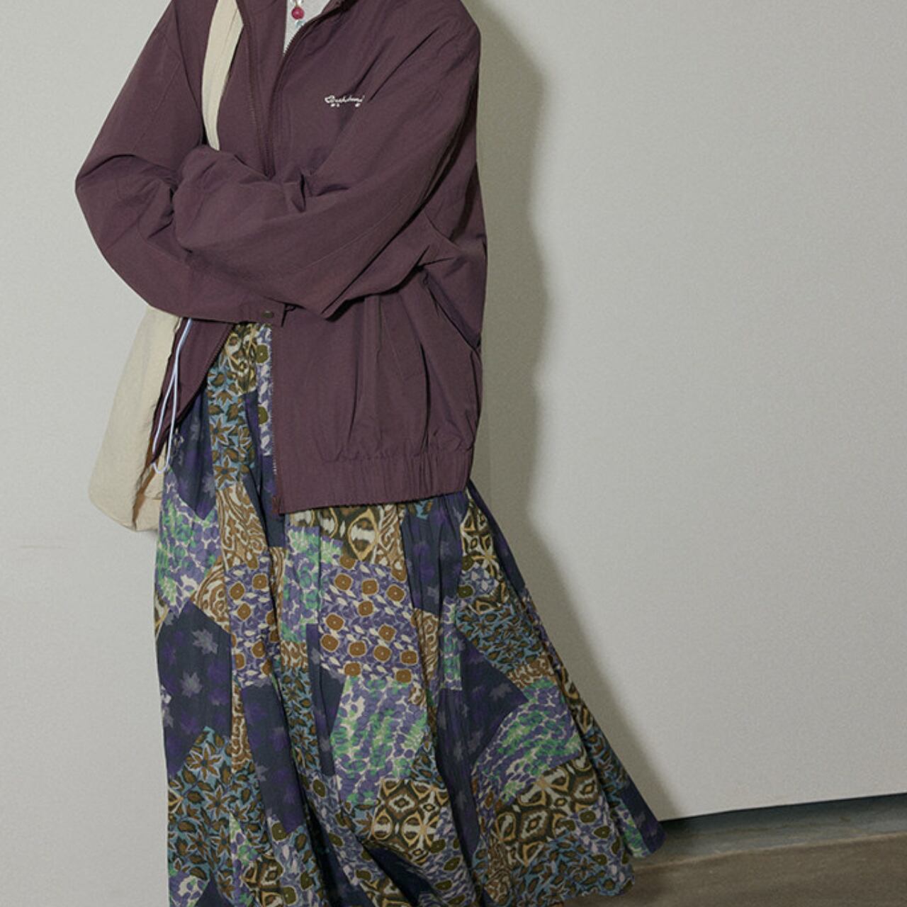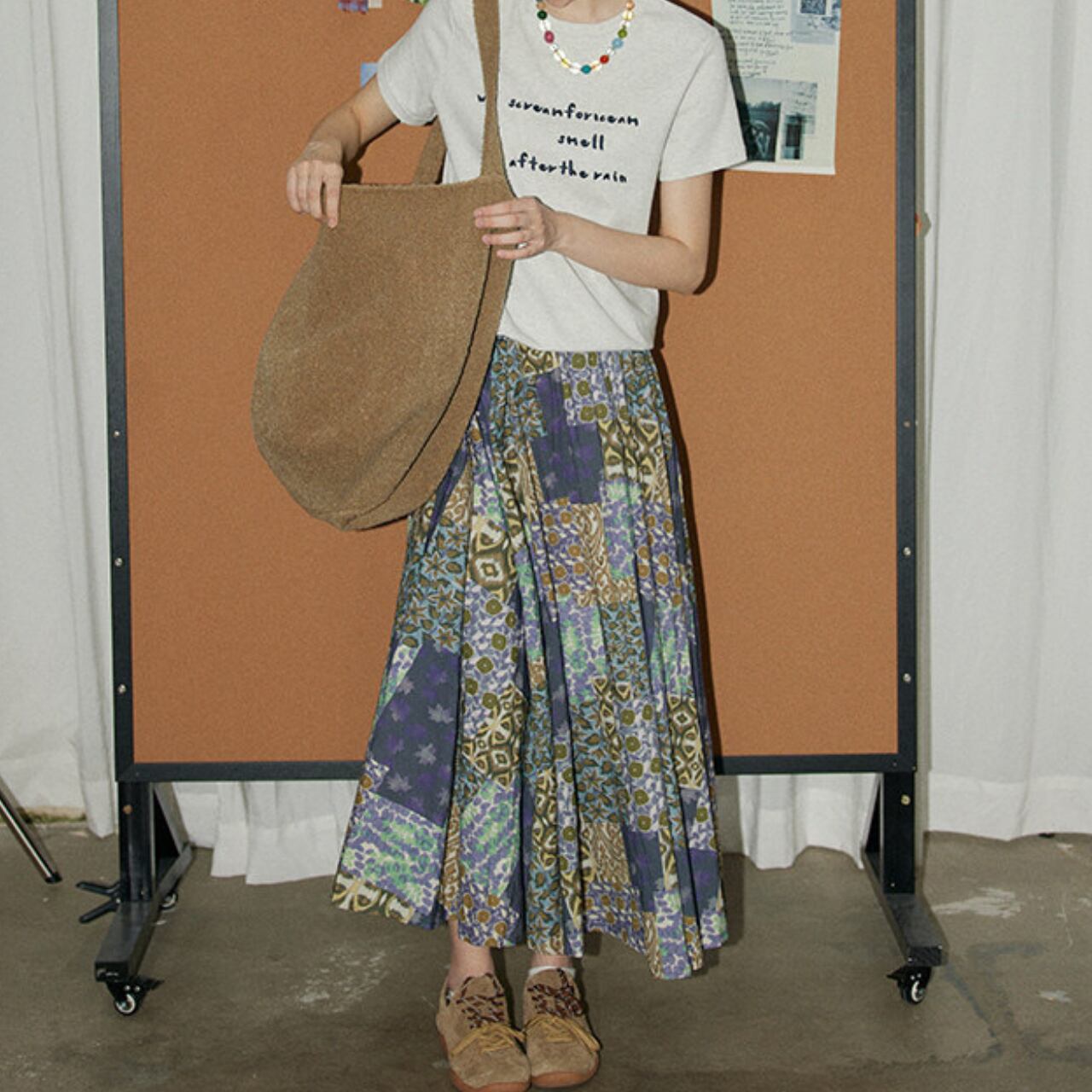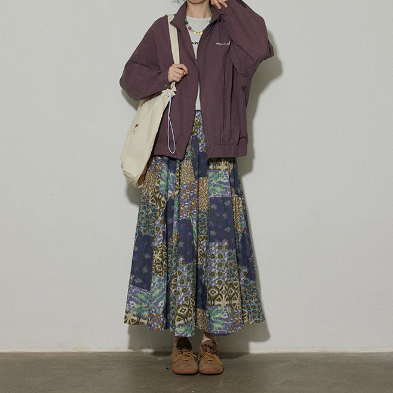 パッチワーク風のデザインが、コーディネートに華やかさをプラスします。