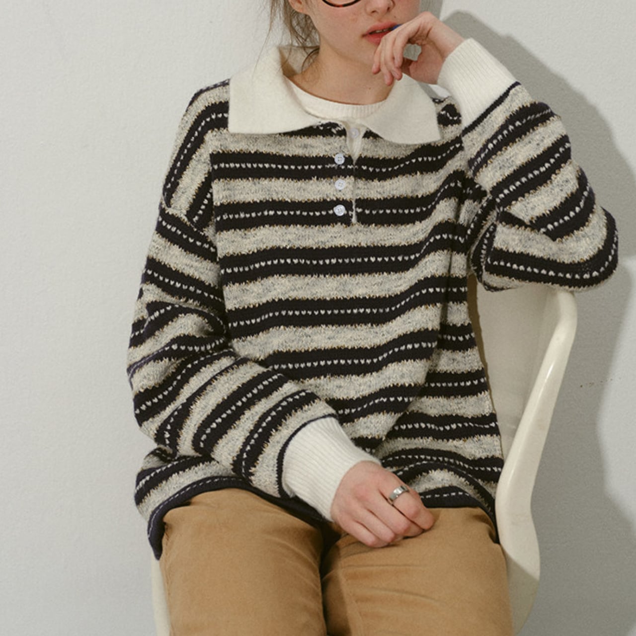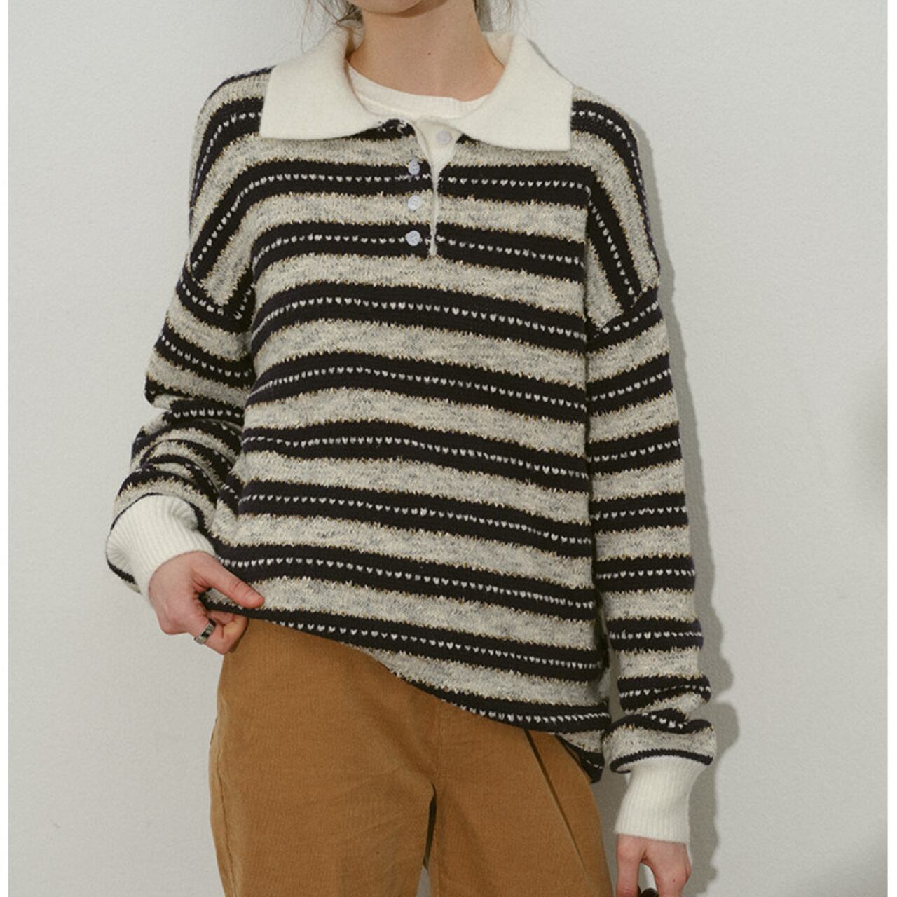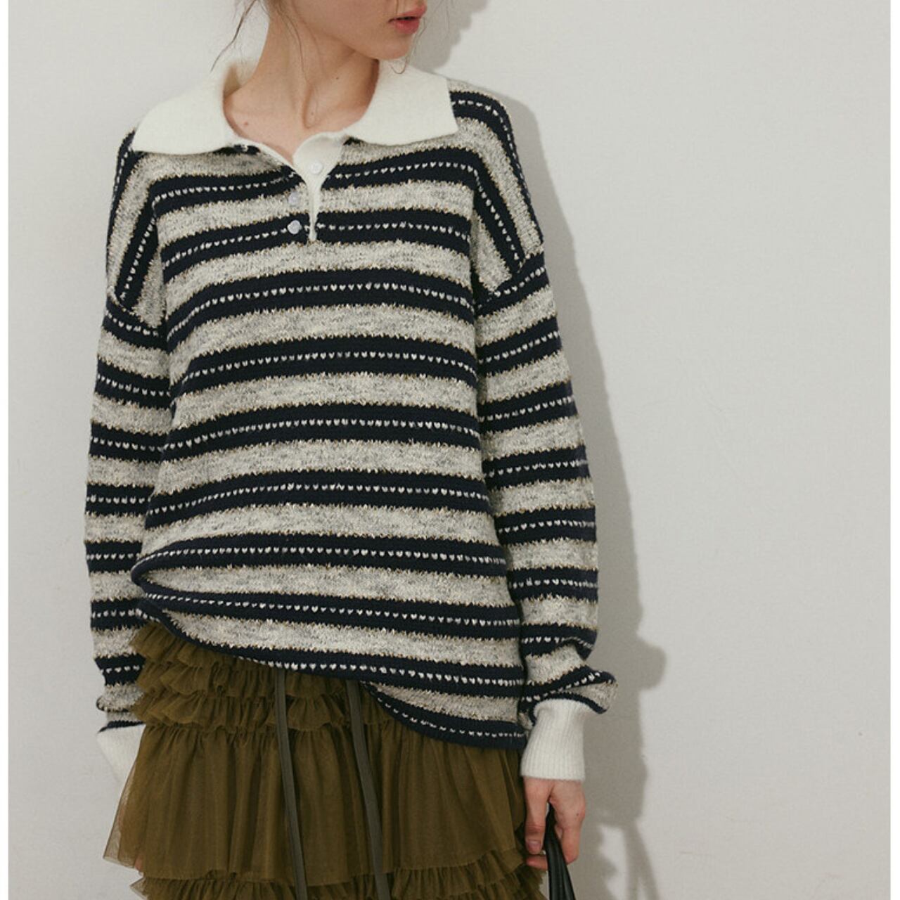カジュアルながらも上品な印象を与える、長袖ストライプニットポロシャツ。