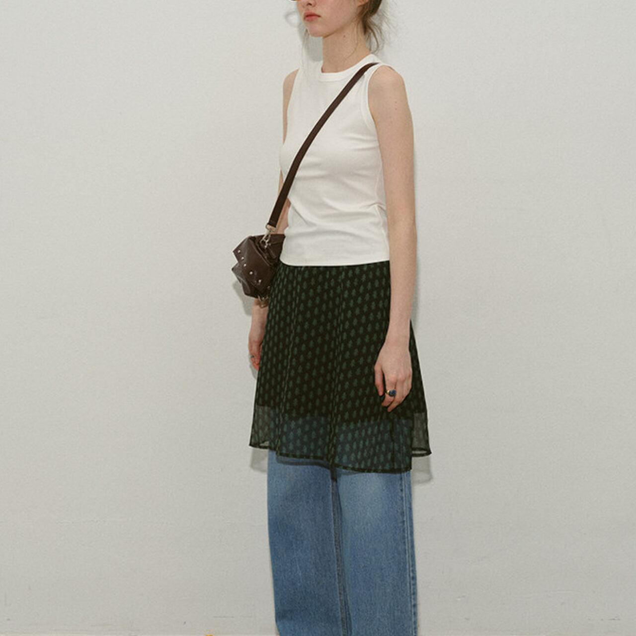 シックな色合いと愛らしいパターンが特徴のミニスカート。